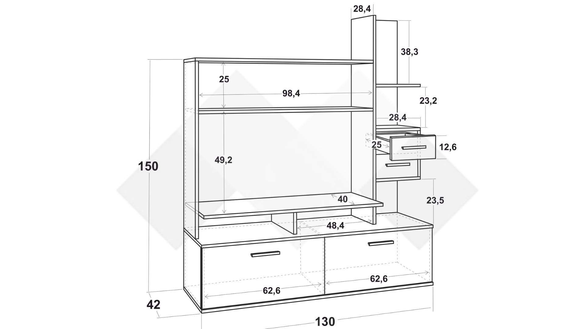 В основата на холна секция Аликанте има широк шкаф с две врати и открита полица, идеална за ТВ приемници и друга техника. Пространството над телевизора също е предвидено за подреждане на вещи, а добавеният гръб на рафта умело завършва дизайна на секцията.
