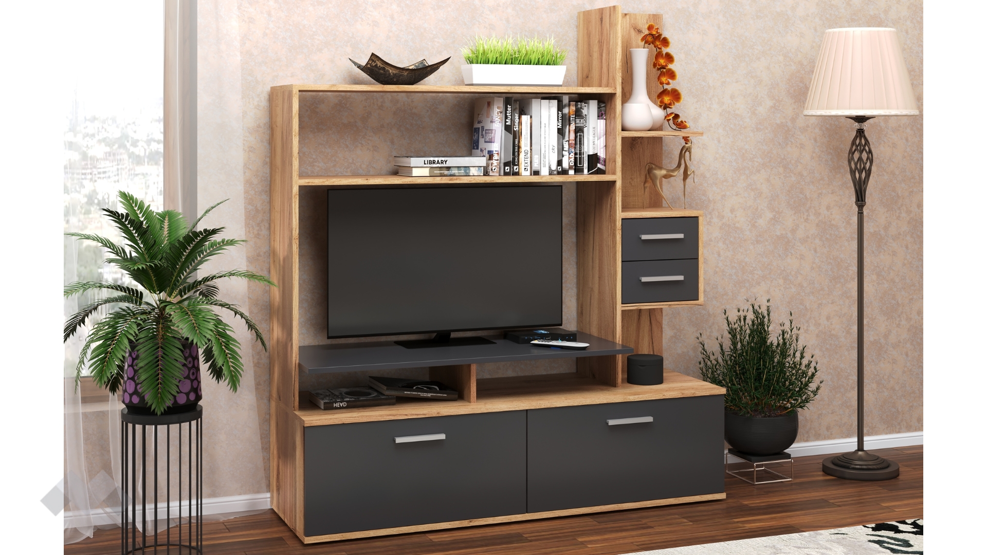 ✓ компактна и функционална ✓ практично разпределение ✓ семпъл и елегантен дизайн ✓ подходяща и за по-малки жилища ✓ открити рафтове ✓ етажерка ✓ ТВ шкаф ✓ чекмеджета ✓ качествена изработка ✓ 16 мм ПДЧ