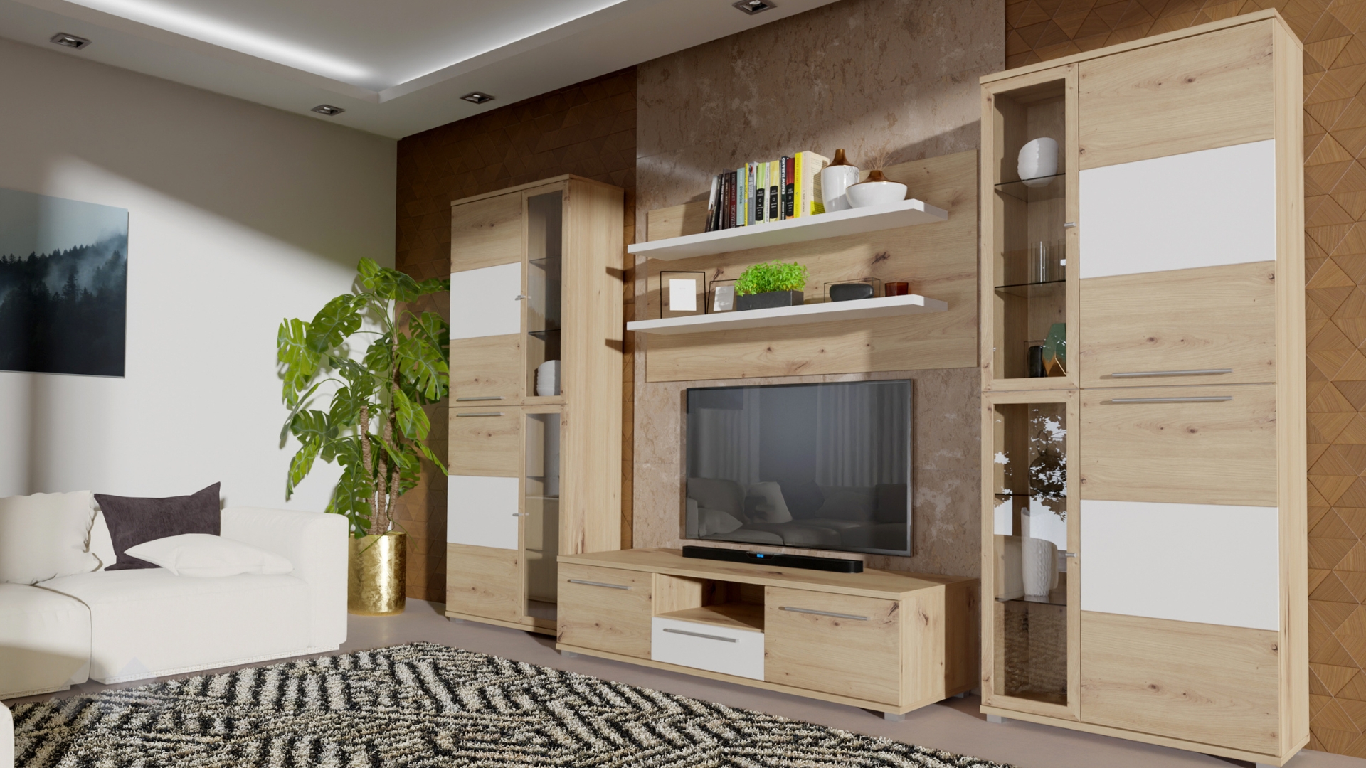 Секцията Алистър е проектирана така, че да предлага изключително разнообразие от възможности за съхранение. С дължина от 334 см, тя е снабдена с практични шкафове, открити рафтове и витрини – идеални за съхранение на книги, ценни сувенири, аудио и видео техника и всичко, което желаете да подредите на видно място. Централното място за телевизор е с размер 149.4 см, предоставяйки простор и удобство за гледане. Високият шкаф и етажерките позволяват съхранение и на по-обемни предмети, като същевременно придават завършен вид на модела.