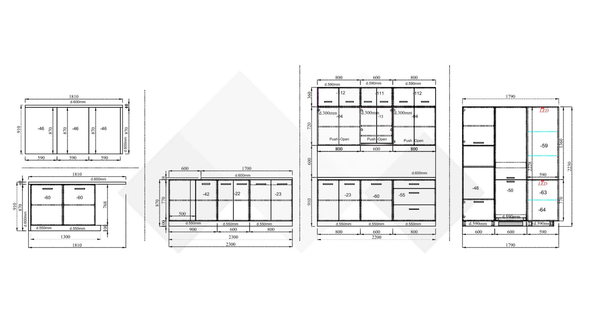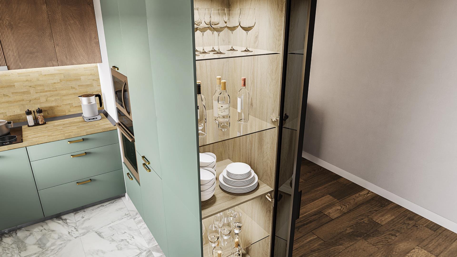 Горния ред шкафове са удобни и функционални - побират малко изполваните уреди и съдове. Основния ред горни шкафове са просторни за най-често използваните уреди и посуда. Шкаф стандартен размер за вграждане на хладилник - за да бъде всичко в синхрон. Шкаф за вграждане на фурна и микровълнова. Долния ред шкафове е функционално подбран - перфектната комбинация на рафтове и чекмеджета, за да поберат често използваните уреди, подправки и посуда. Витринния шкаф е с опушени матови стъкла 4 мм., 4 рафта и LED осветление, за да изглежда още по-елегантно. Долния ред шкафове е функционално подбран - перфектната комбинация на шкафове с рафтове и чекмеджета, за да поберат често използваните уреди, подправки и посуда, а с Г-образния остров имаш допълнително пространство за съхранение и плотове за създаване на вкусотии.