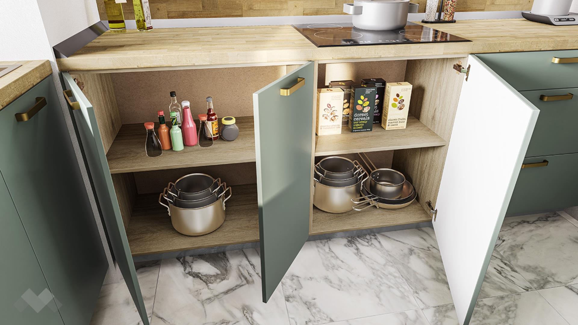 Страхотната модерна комбинация между корпус сонома арвен и лице крийм гланц, олив мат и дъб натурал, придава на кухнята характер и уют.