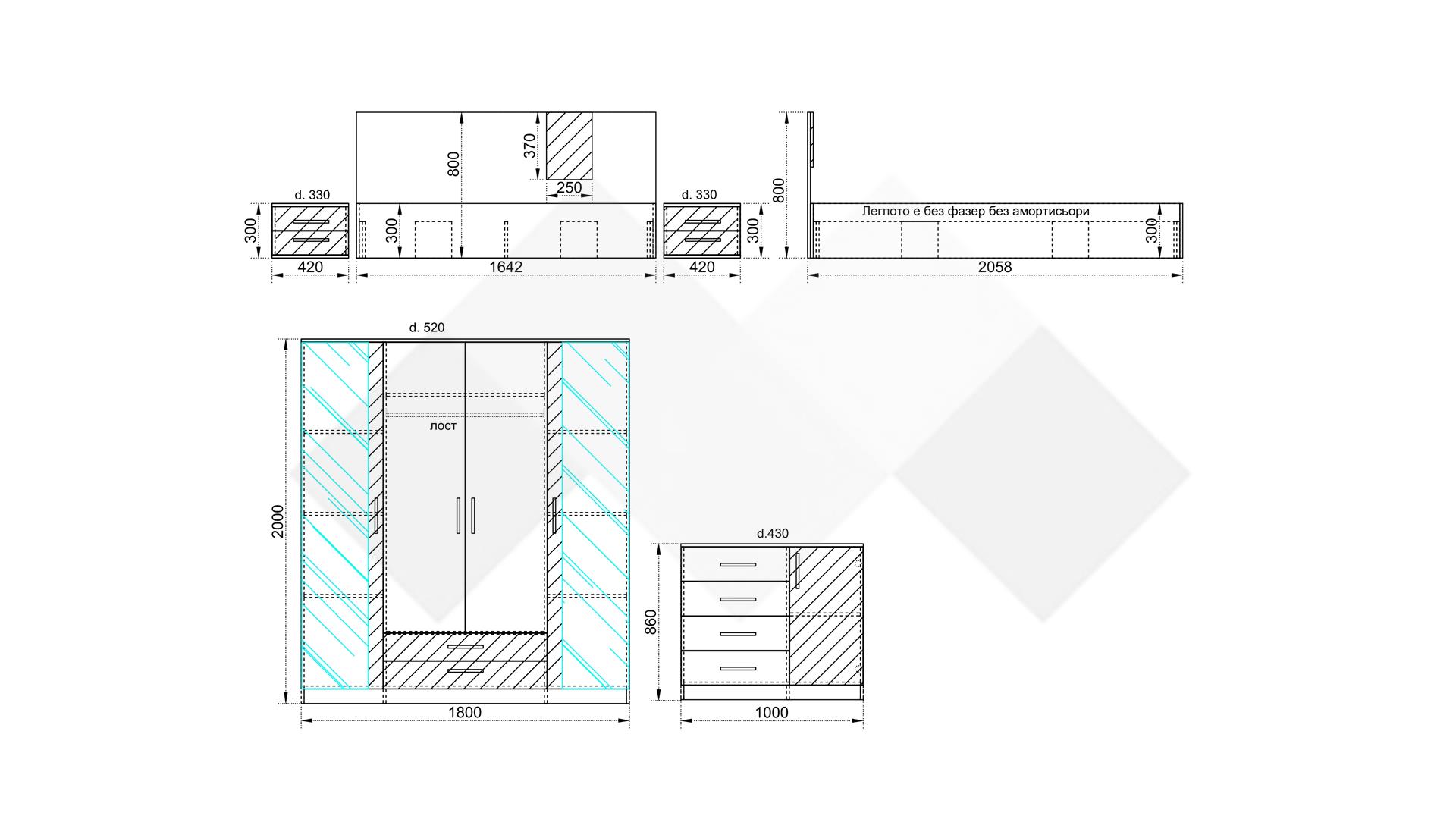 ✓ модерен винтидж декор ✓ четирикрилен гардероб с огледало ✓ спалня с нощни шкафчета ✓ скрин ✓ 16 мм ПДЧ