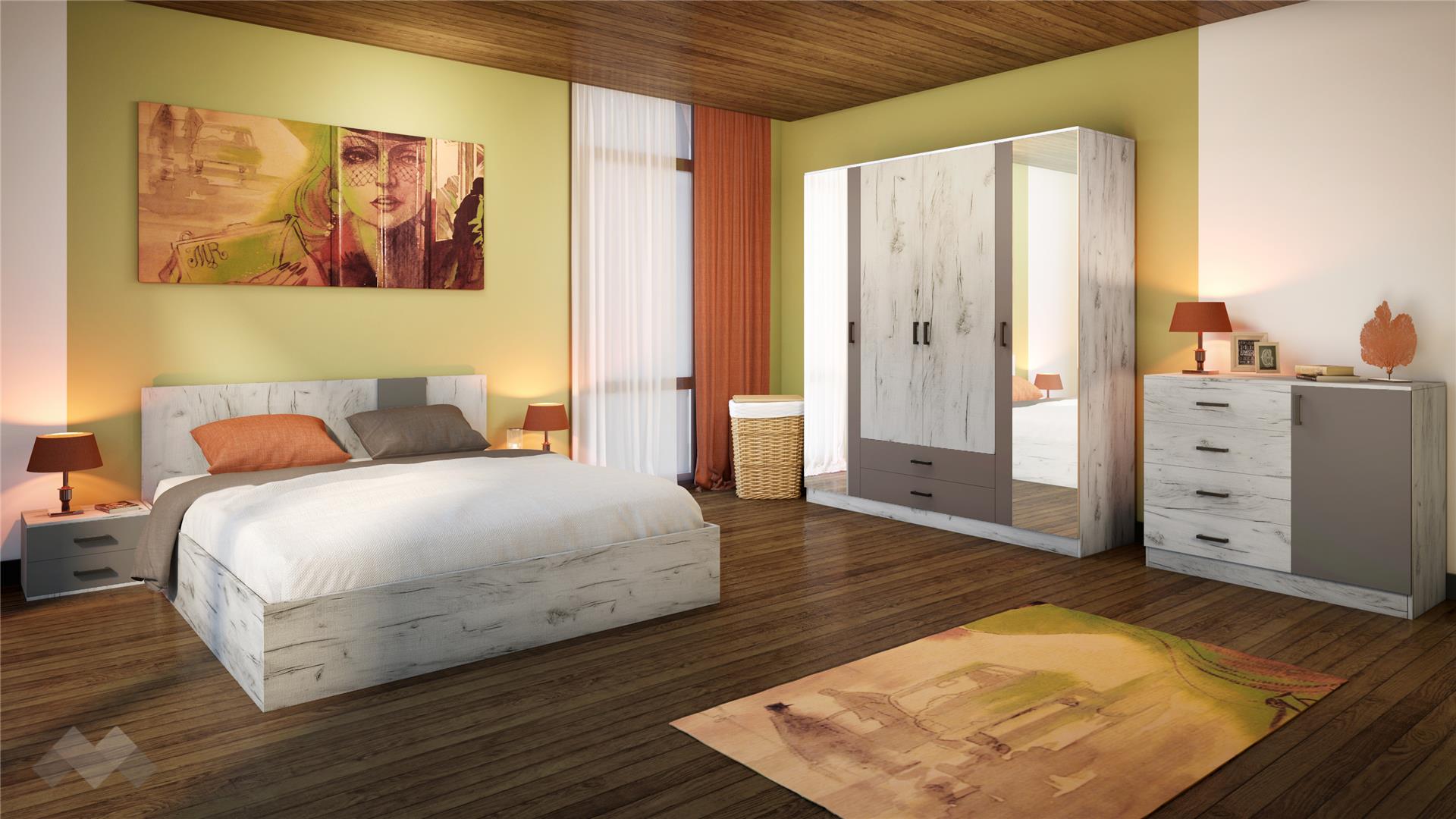 ⭐ Предимства: ✓ модерен винтидж декор ✓ четирикрилен гардероб с огледало ✓ спалня с нощни шкафчета ✓ скрин ✓ 16 мм ПДЧ