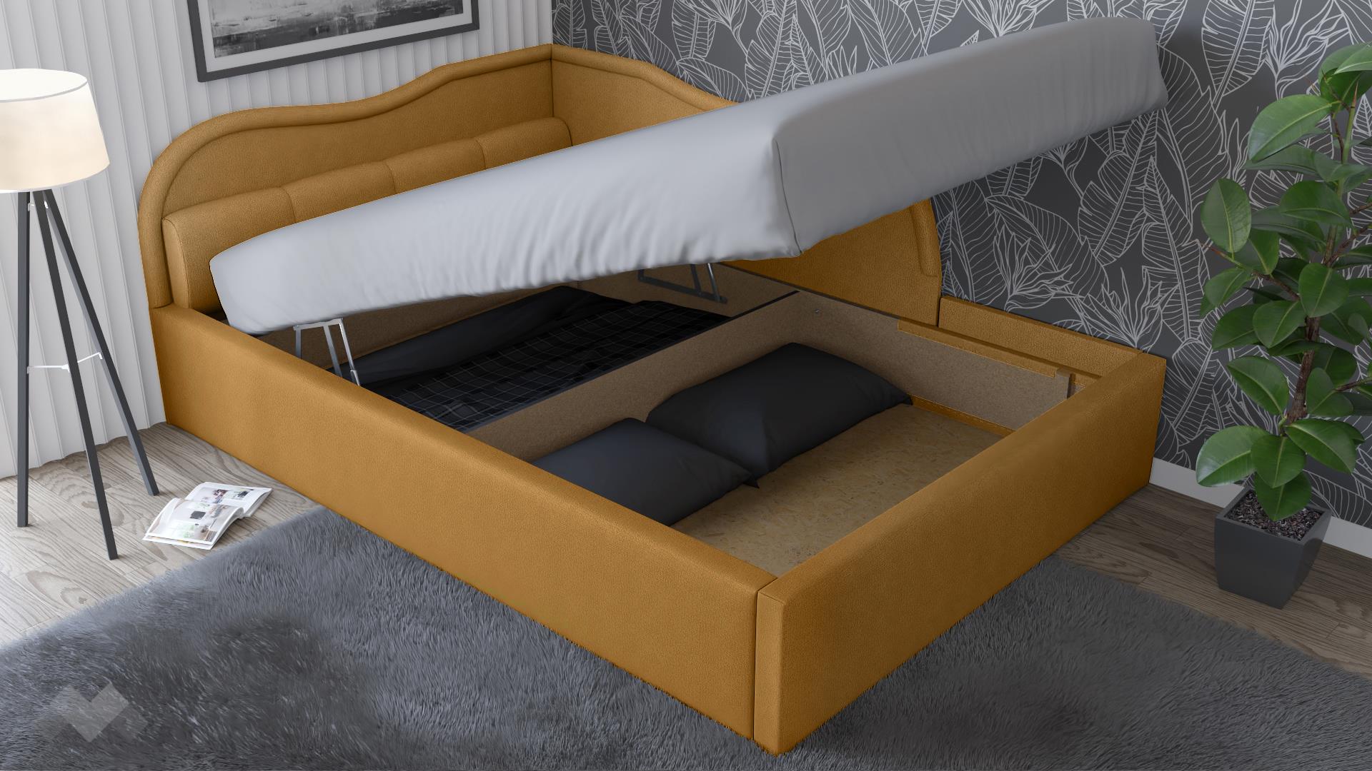 Леглото е с меки форми и елегантен дизайн. Подходящо е за матрак 140/200 см. Под матрака се открива широко пространство, готово да побере всички възглавници и завивки, на които все не намираш място. Така не се налага да закупуваш допълнителни шкафове у дома и пестиш пространство и пари.