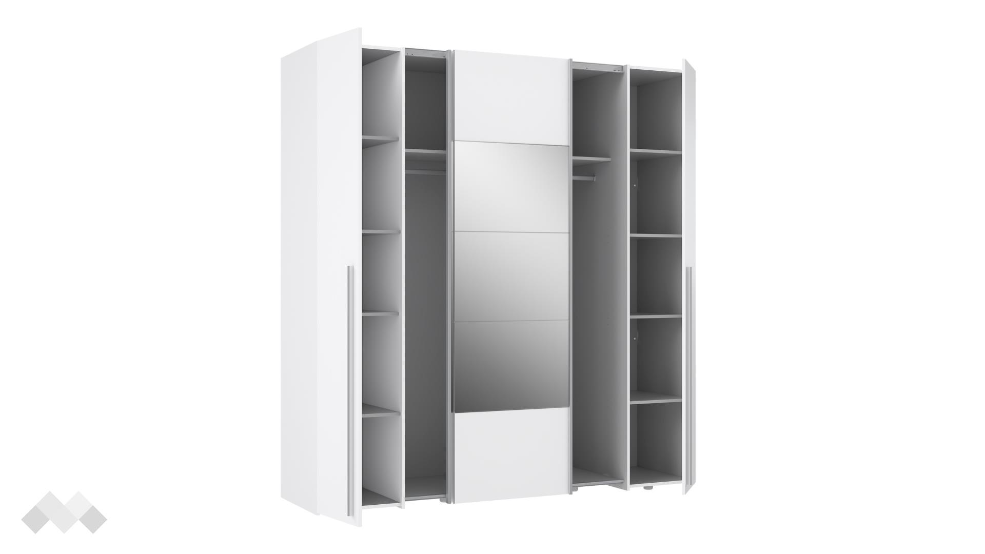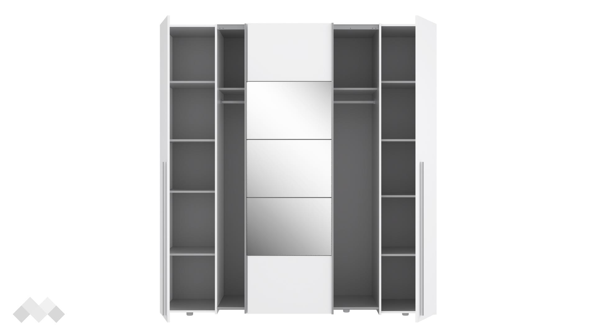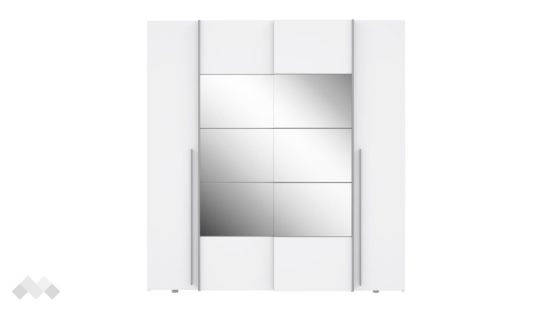 Гардеробът комбинира плъзгащи и стандартни врати, предлагайки практично решение за съхранение и удобен достъп до вещите. Със своя четирикрилен дизайн и внушителни размери, той е подходящ за просторни спални и помещения, в които подредбата и стилът вървят ръка за ръка.