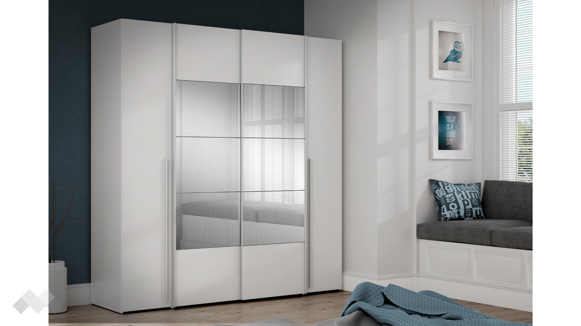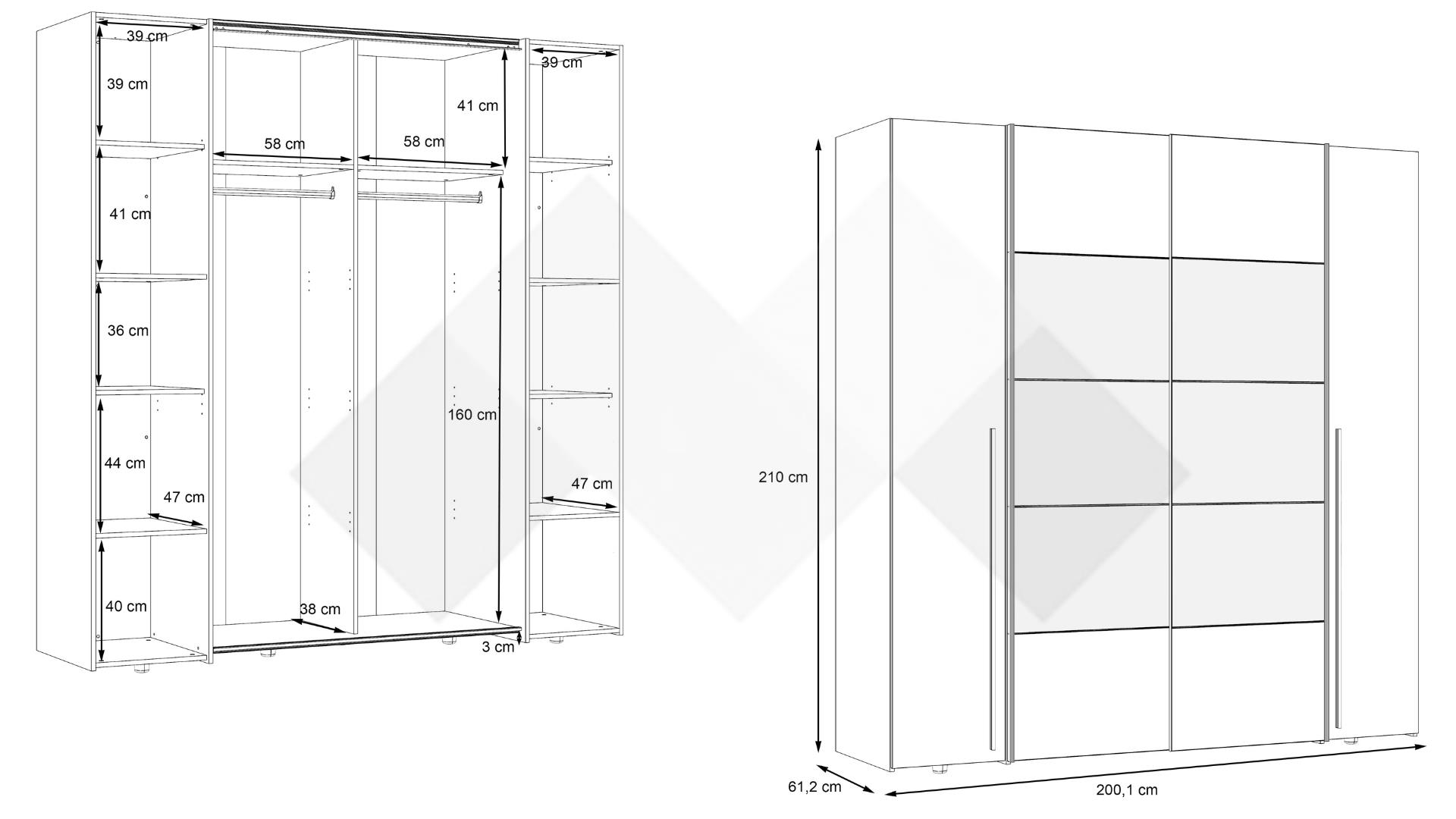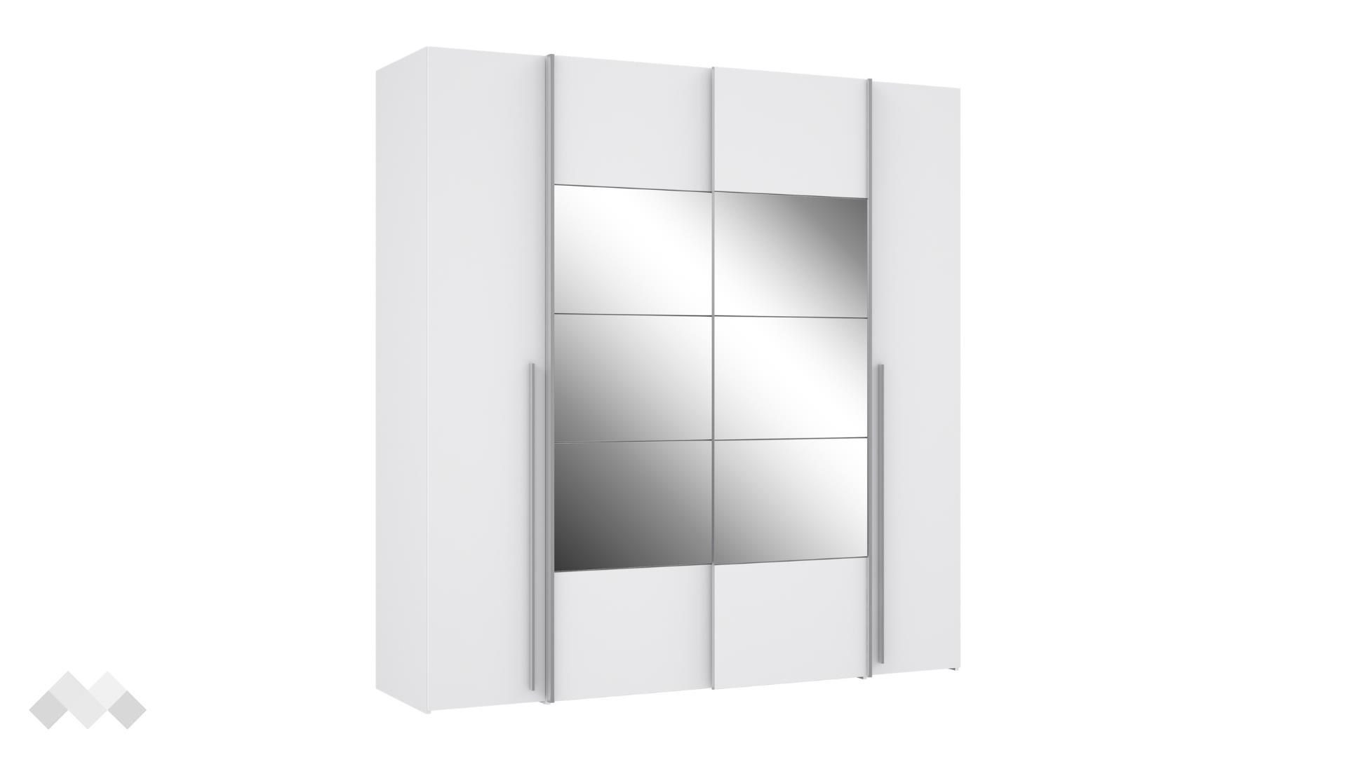 Гардеробът комбинира плъзгащи и стандартни врати, предлагайки практично решение за съхранение и удобен достъп до вещите. Със своя четирикрилен дизайн и внушителни размери, той е подходящ за просторни спални и помещения, в които подредбата и стилът вървят ръка за ръка.