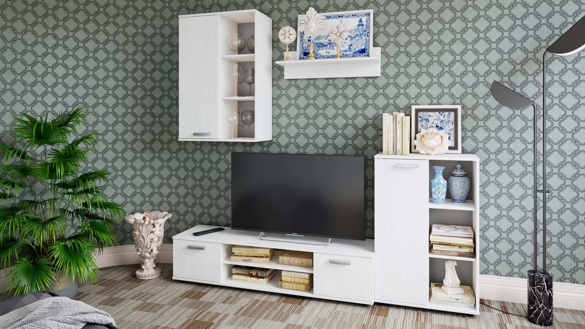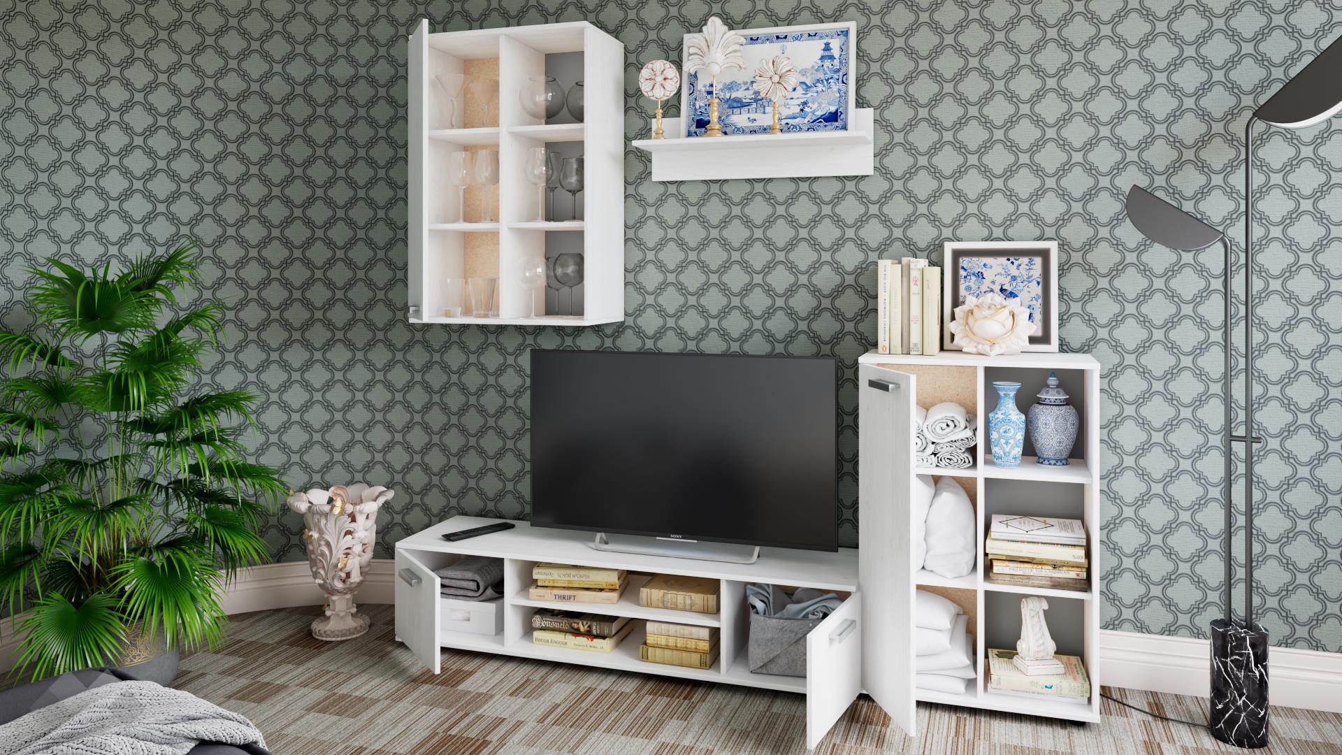 ⭐ Предимства: ✓ модерен декор ✓ ТВ шкаф с широк плот ✓ висок шкаф ✓ окачен шкаф ✓ етажерка ✓ асиметричен дизайн ✓ 16 мм ПДЧ