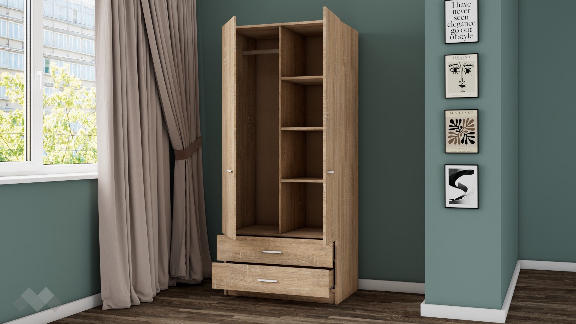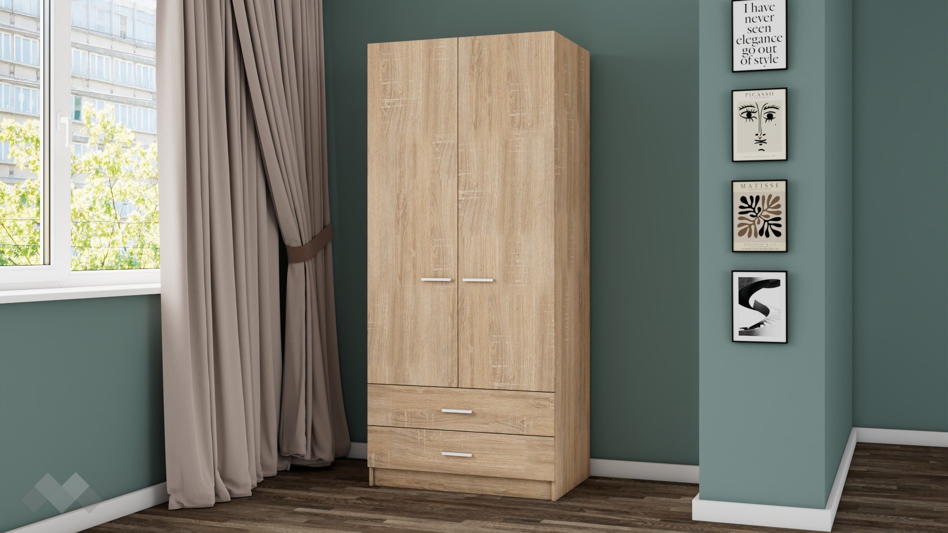 Гардеробът разполага с две врати, зад които е разположен лост за закачалки – идеален за съхранение на дрехи, които изискват окачване. В долната част на гардероба има две просторни чекмеджета, подходящи за сгънати дрехи, спално бельо или аксесоари.