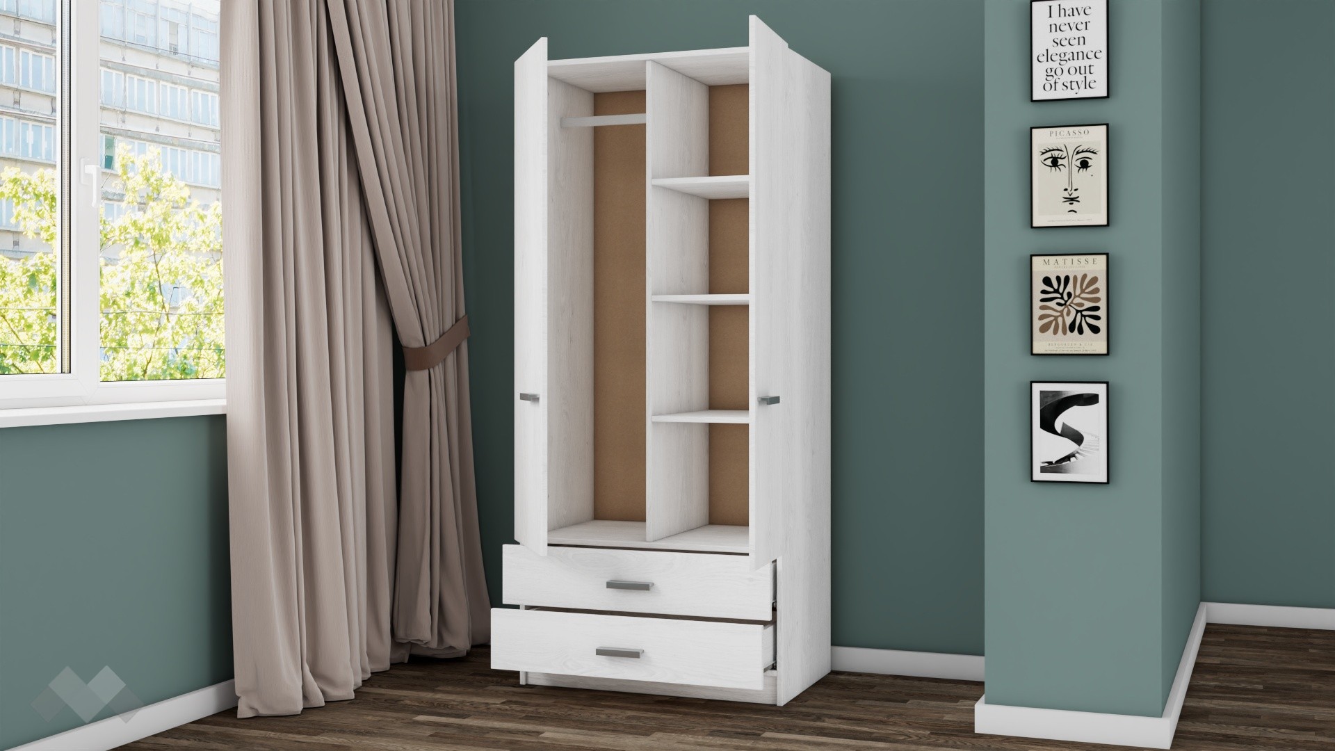 Гардеробът разполага с две врати, зад които е разположен лост за закачалки – идеален за съхранение на дрехи, които изискват окачване. В долната част на гардероба има две просторни чекмеджета, подходящи за сгънати дрехи, спално бельо или аксесоари.