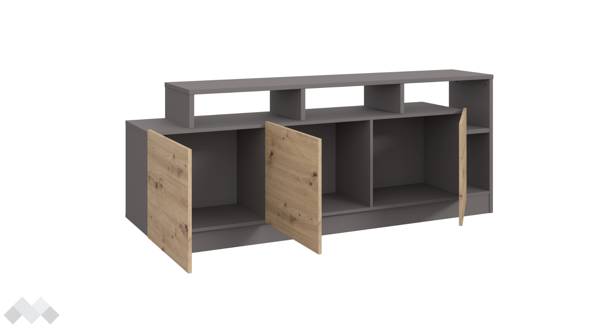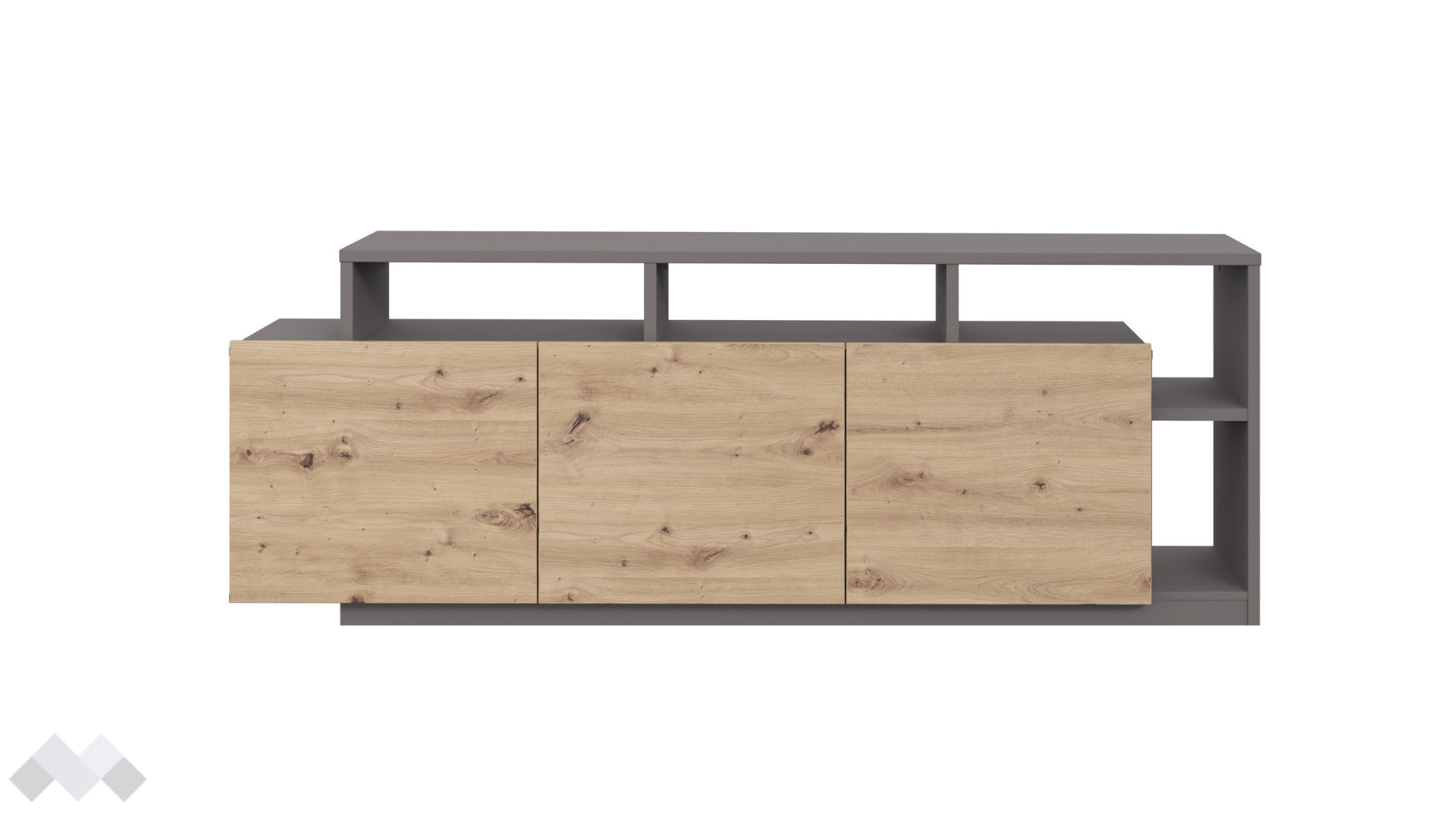Благодарение на балансирания си дизайн и просторната горна повърхност, шкафът е подходящ за телевизори с различни размери. Семплата визия и функционалното разпределение го правят подходящ избор за модерна дневна или хол.