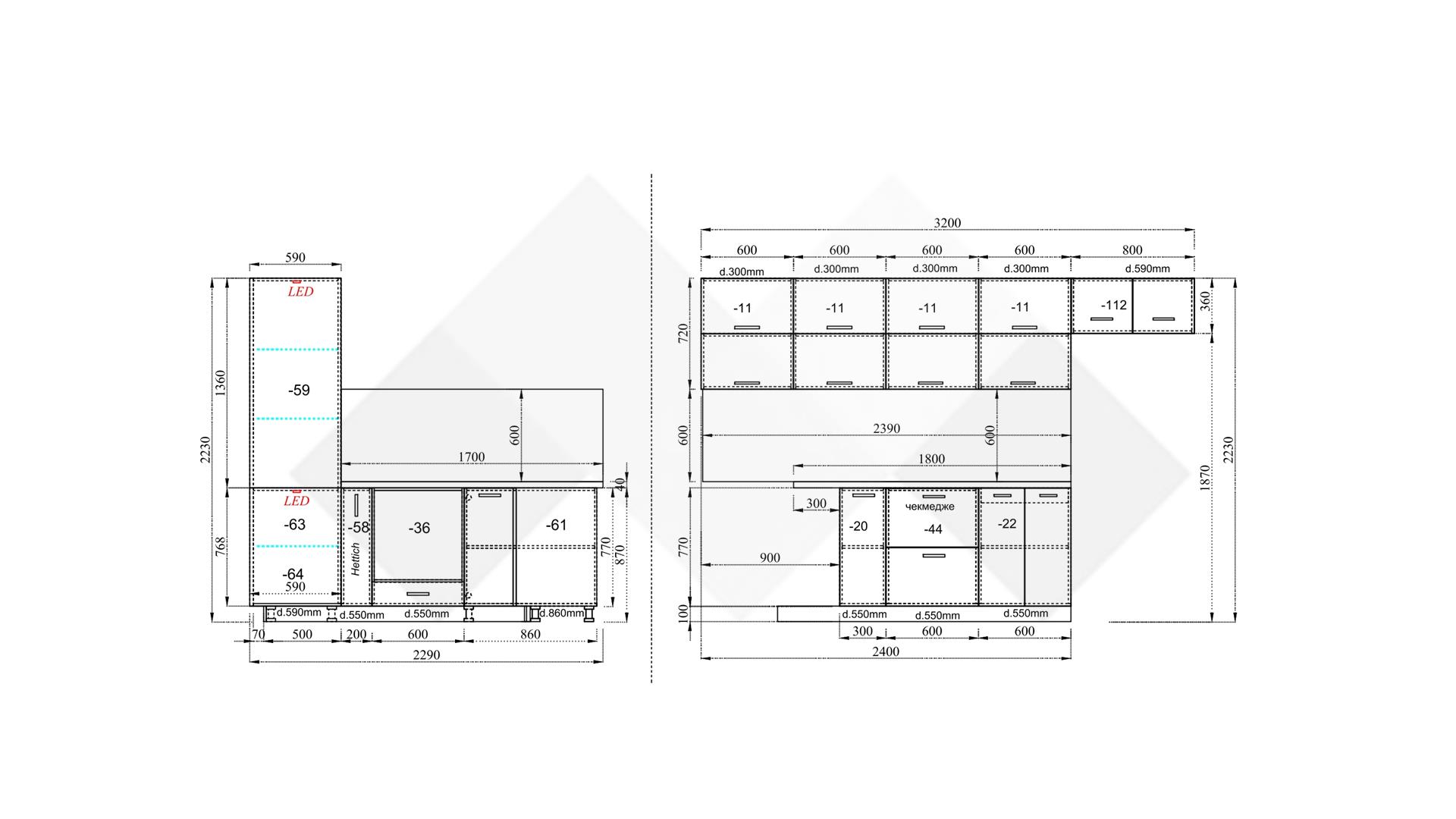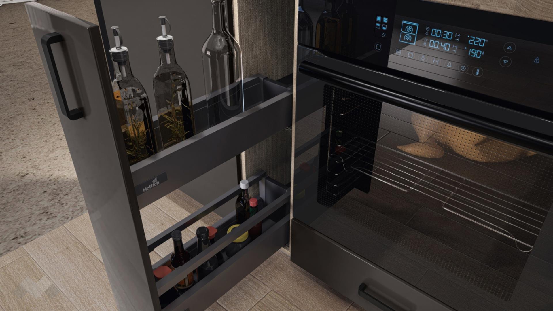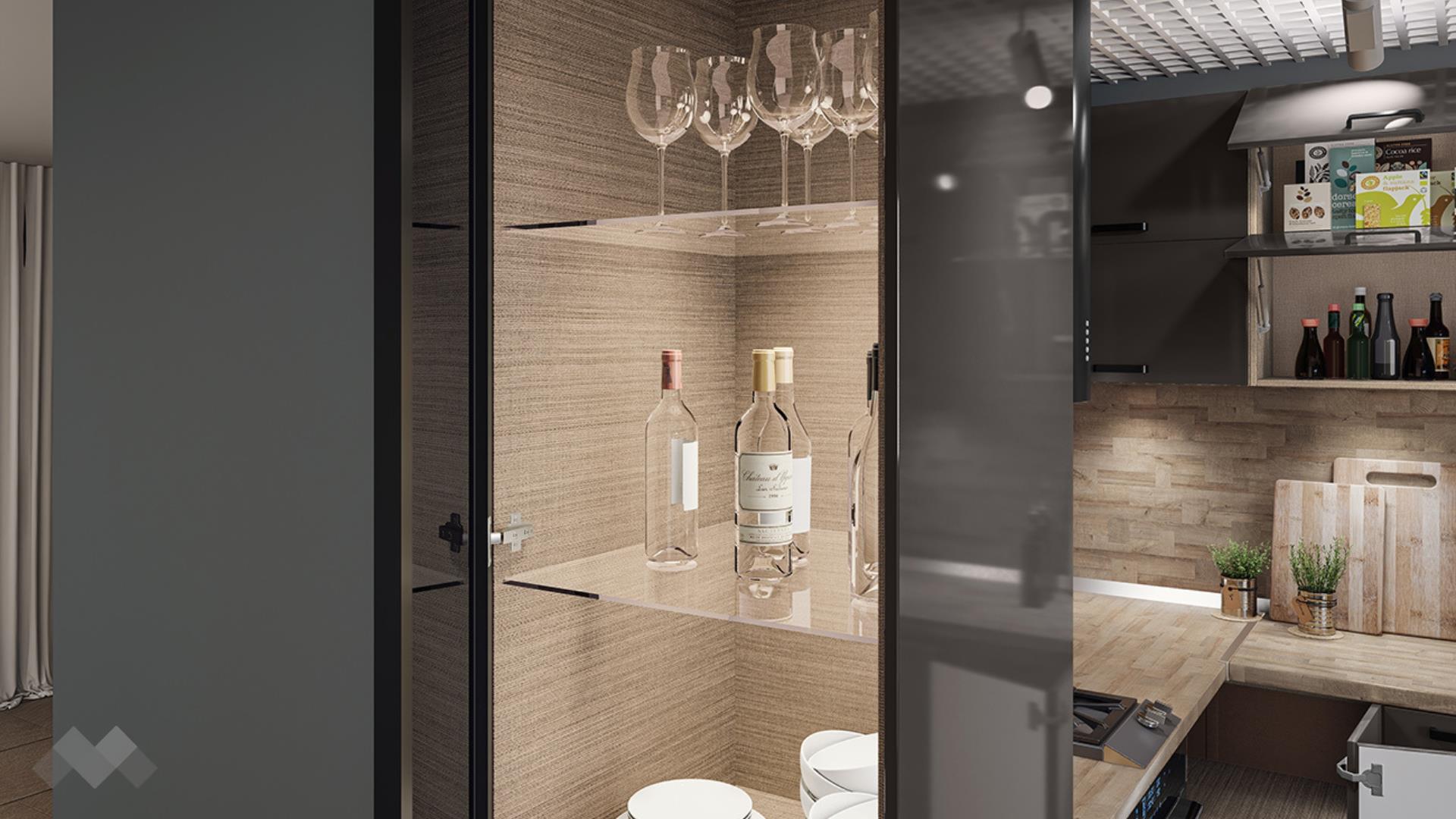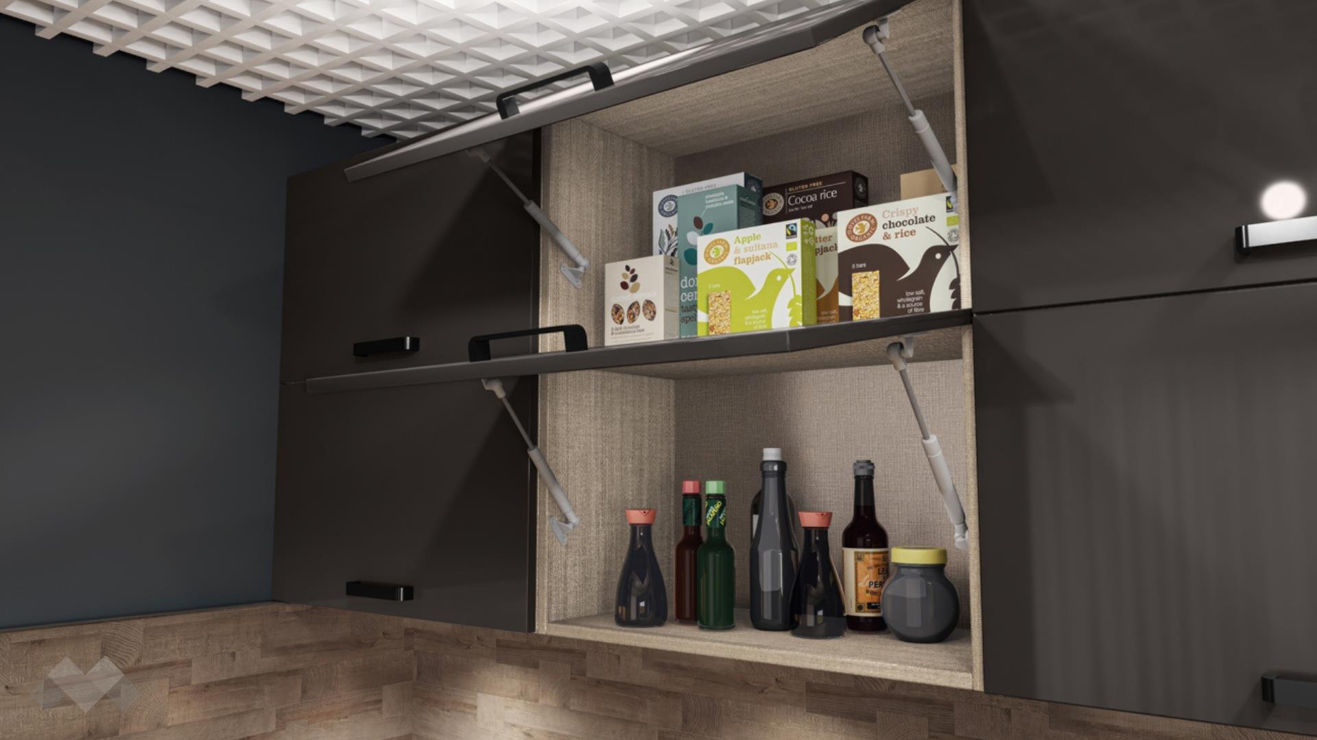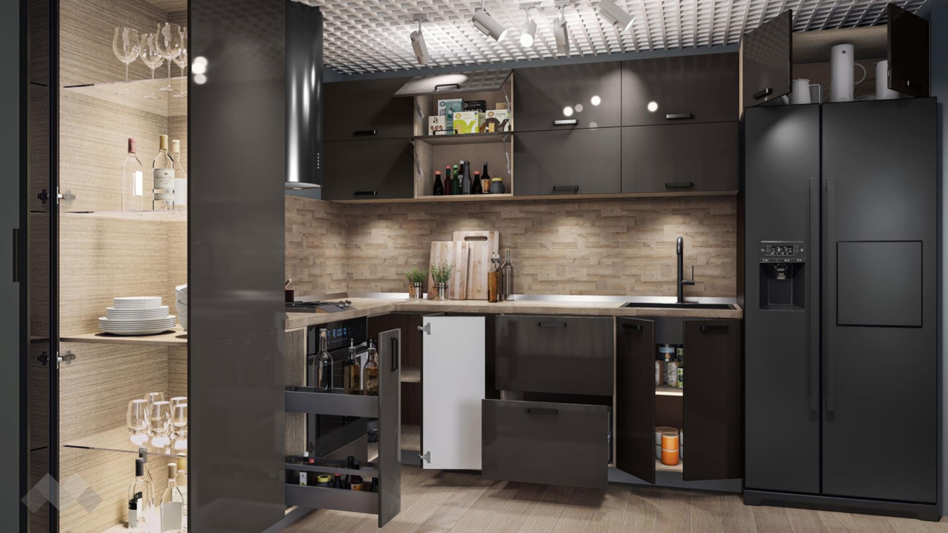 Горният ред шкафове са просторни за най-често използваните уреди и посуда. Шкаф за вграждане на фурна. Долния ред шкафове е функционално подбран - перфектната комбинация на рафтове и чекмеджета, за да поберат често използваните уреди, подправки и посуда. Витринния шкаф е с опушени матови стъкла 4 мм., 4 рафта и LED осветление, за да изглежда още по-елегантно.