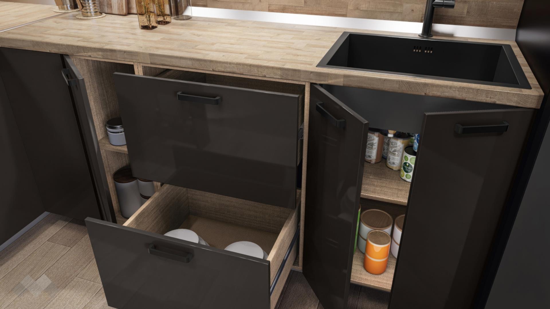Страхотната модерна комбинация между корпус мока и лице антрацит гланц, придава на кухнята характер и уют.