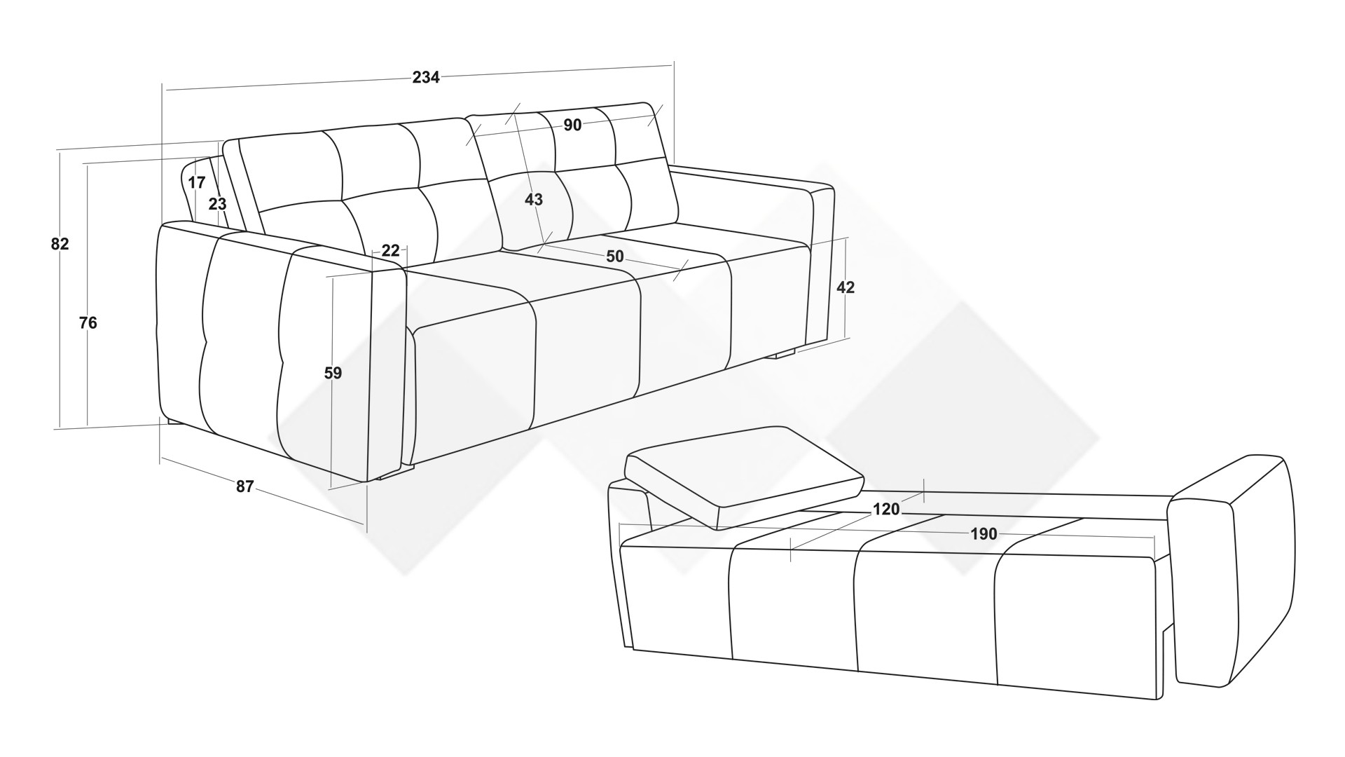 Д: 234 см Ш: 87 см В: 82 см