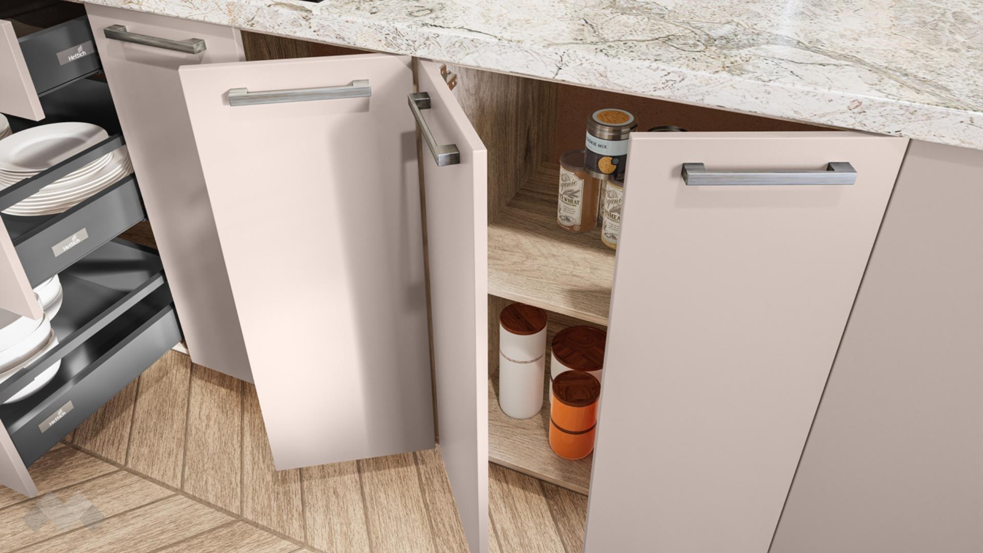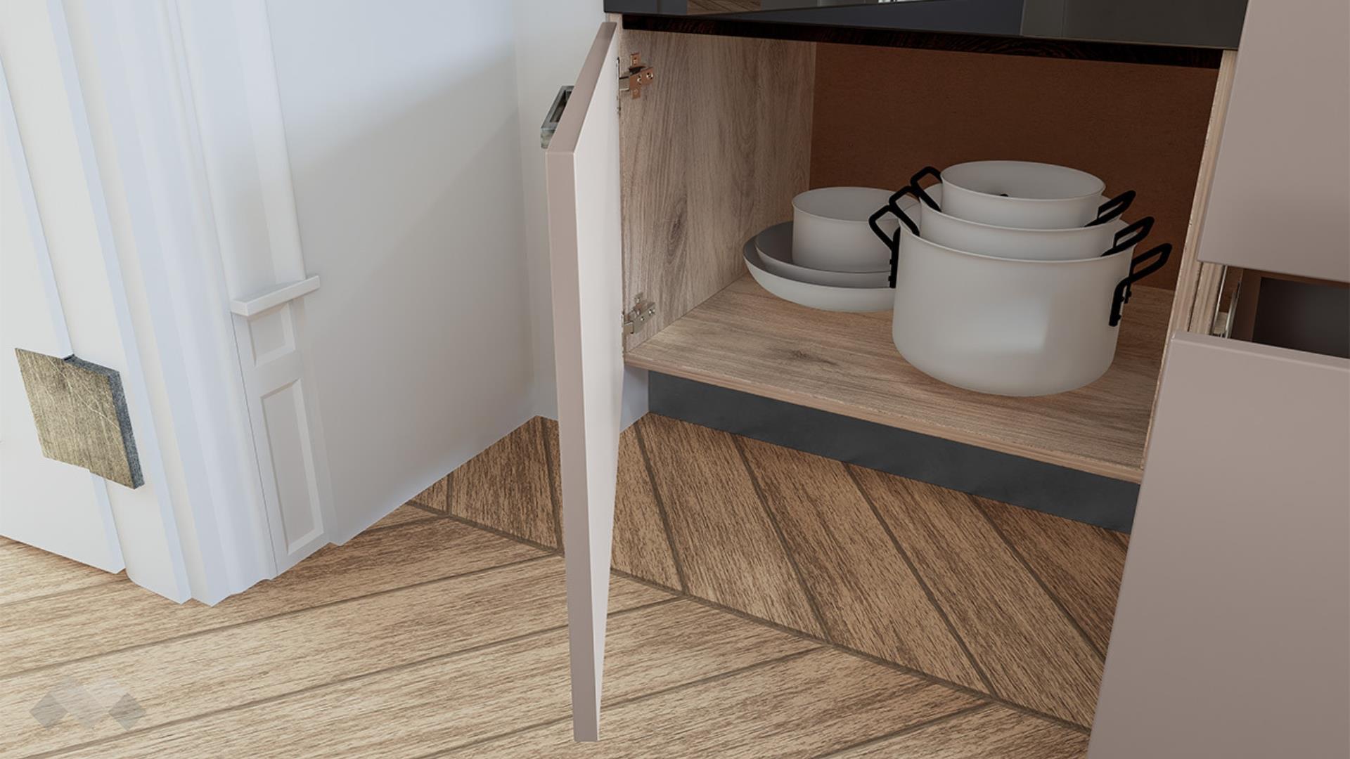 Горния ред шкафове са удобни и функционални - побират малко изполваните уреди и съдове. Основния ред горни шкафове са просторни за най-често използваните уреди и посуда. Шкаф стандартен размер за вграждане на хладилник - за да бъде всичко в синхрон. Шкаф за вграждане на фурна и микровълнова. Долния ред шкафове е функционално подбран - перфектната комбинация на рафтове и чекмеджета, за да поберат често използваните уреди, подправки и посуда.