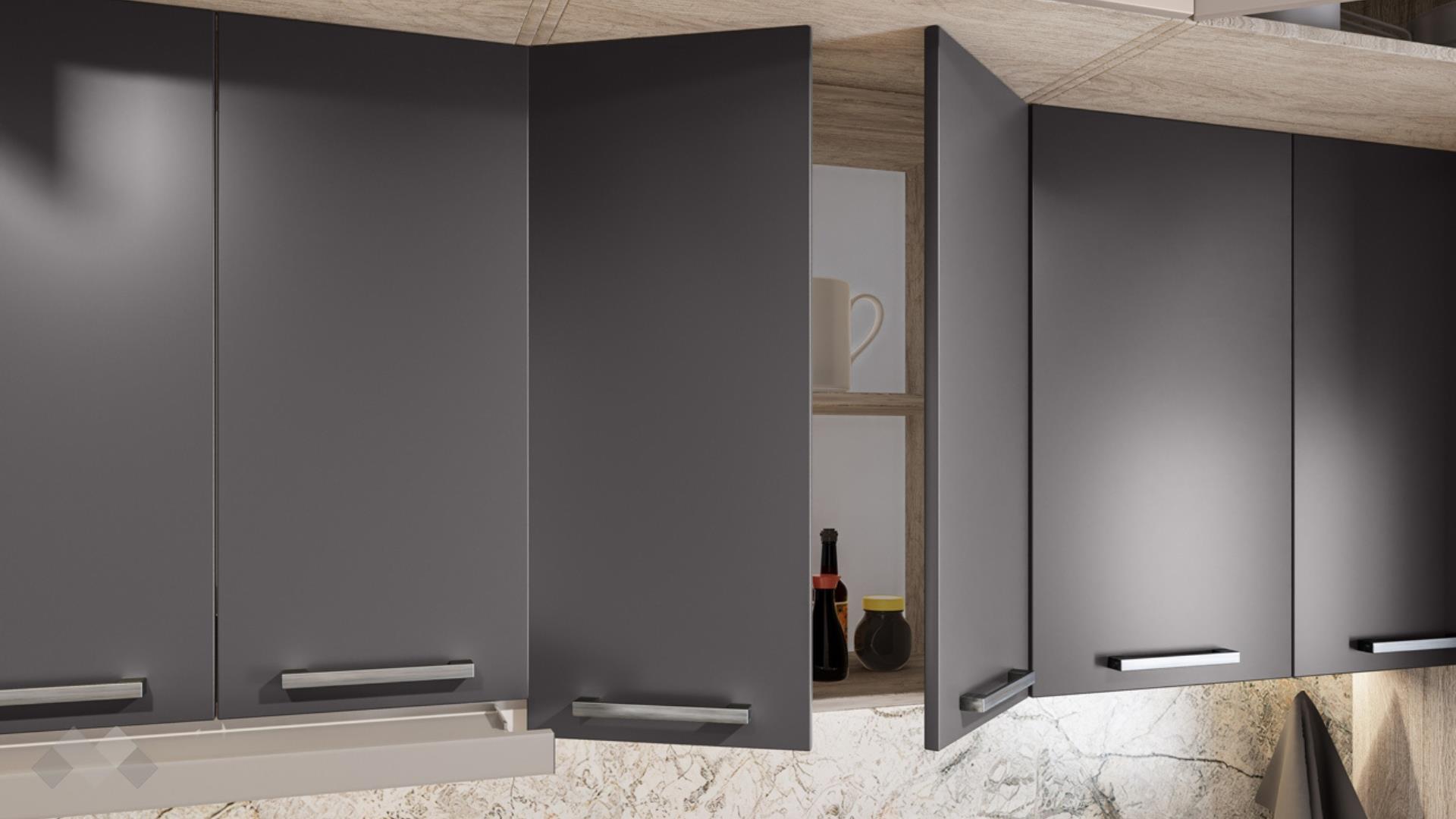 Кухнята е изработена от 16 мм ПДЧ корпус и 18 мм фолиран МДФ. Предимството на фолирания МДФ е, че материалът покрива цялата повърхност, включително и кантовете на детайла, т.е. материалът е облечен изцяло. Термоплотът идва при теб цял, за да можеш да го пригодиш спрямо твоите предпочитания и е в цвят Небула. Всички врати и чекмеджета са с механизъм за плавно затваряне.