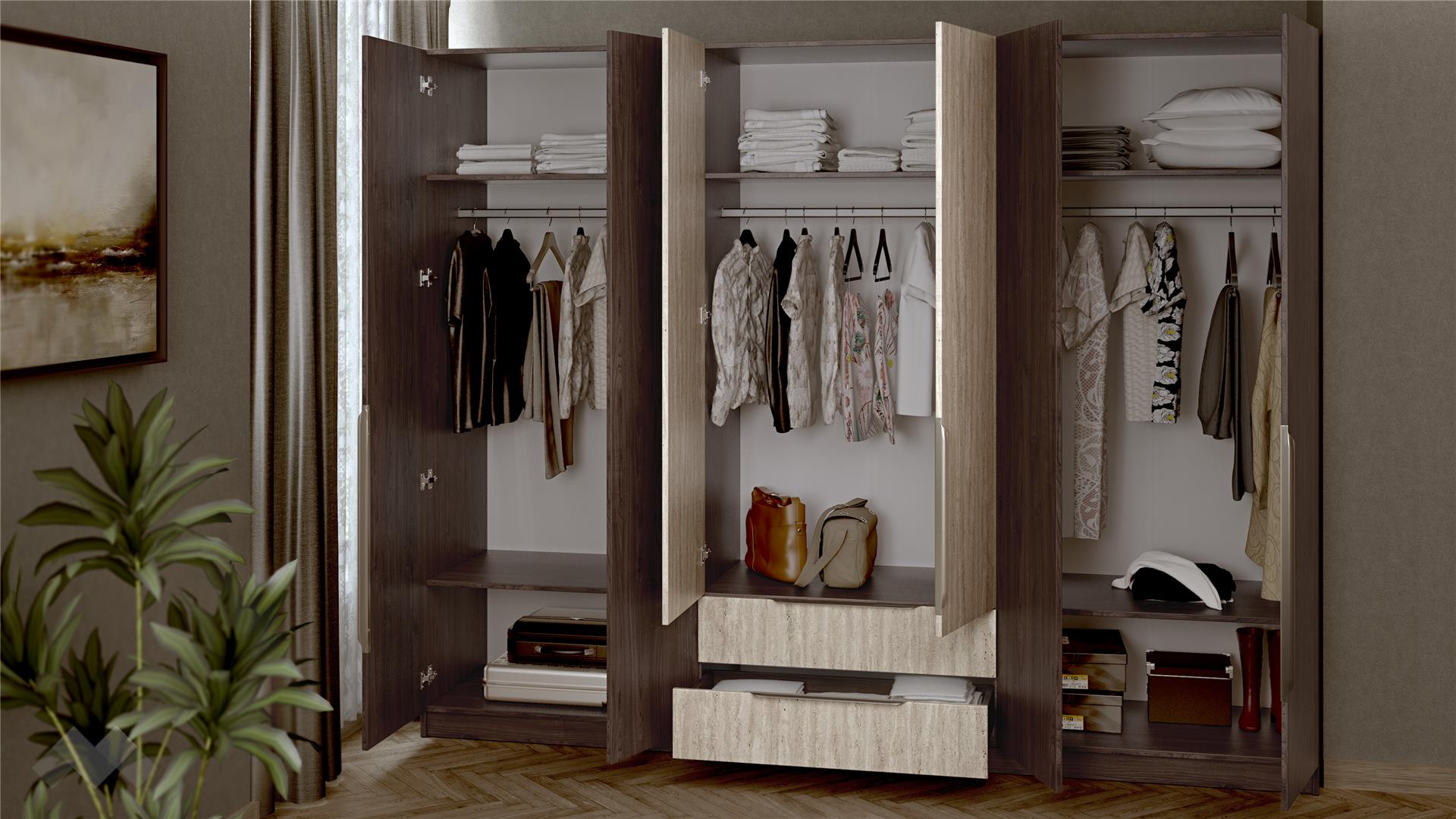 ⭐ Предимства: ✓ 18 мм ПДЧ ✓ шесткрилен ✓ 5 рафта ✓ 3 лоста за закачалки ✓ 2 чекмеджета ✓ плавно затваряне на вратите ✓ модерен декор ✓ практично разпределение ✓ качествена изработка