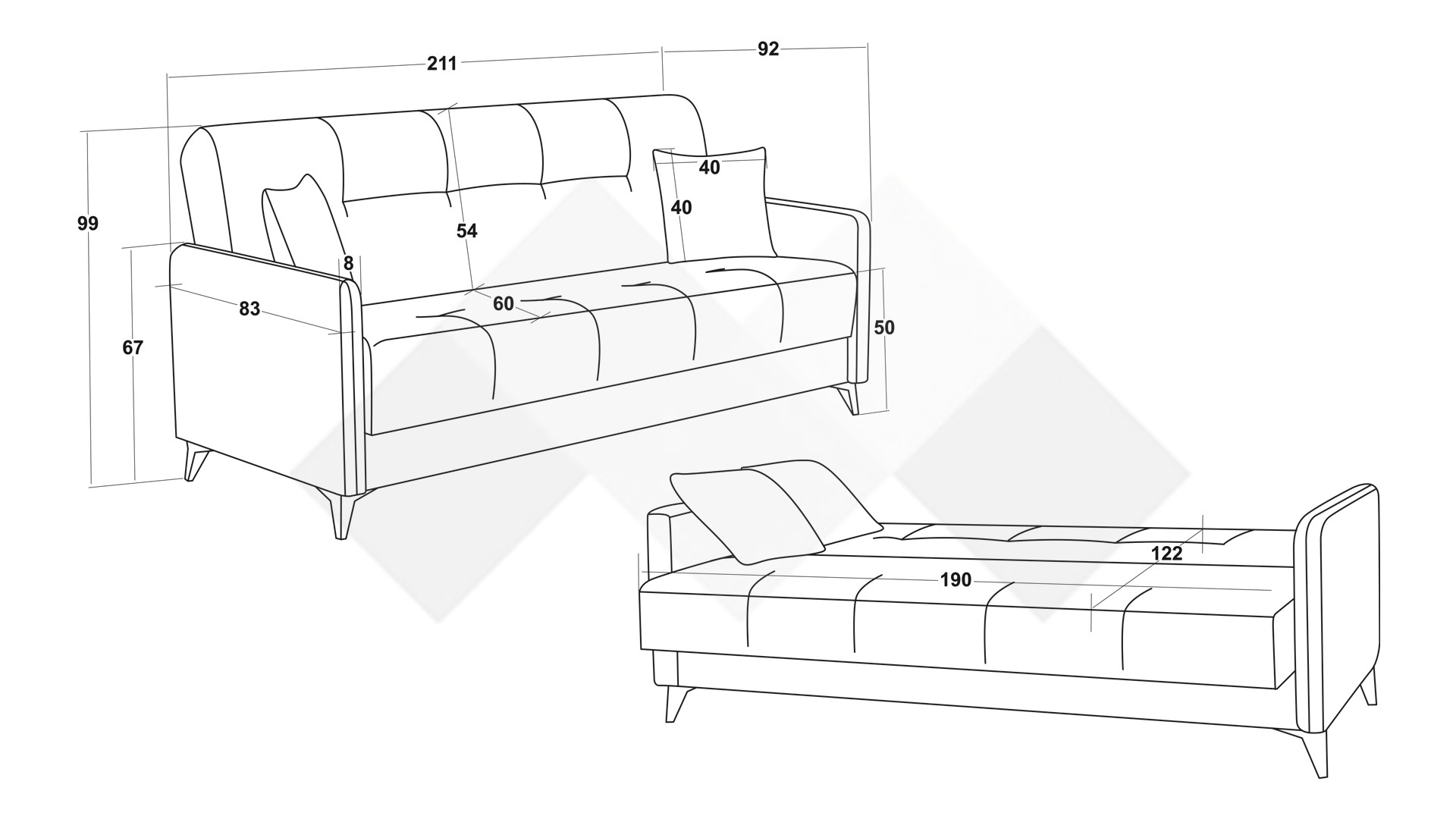 Д: 211 см Ш: 92 см В: 99 см