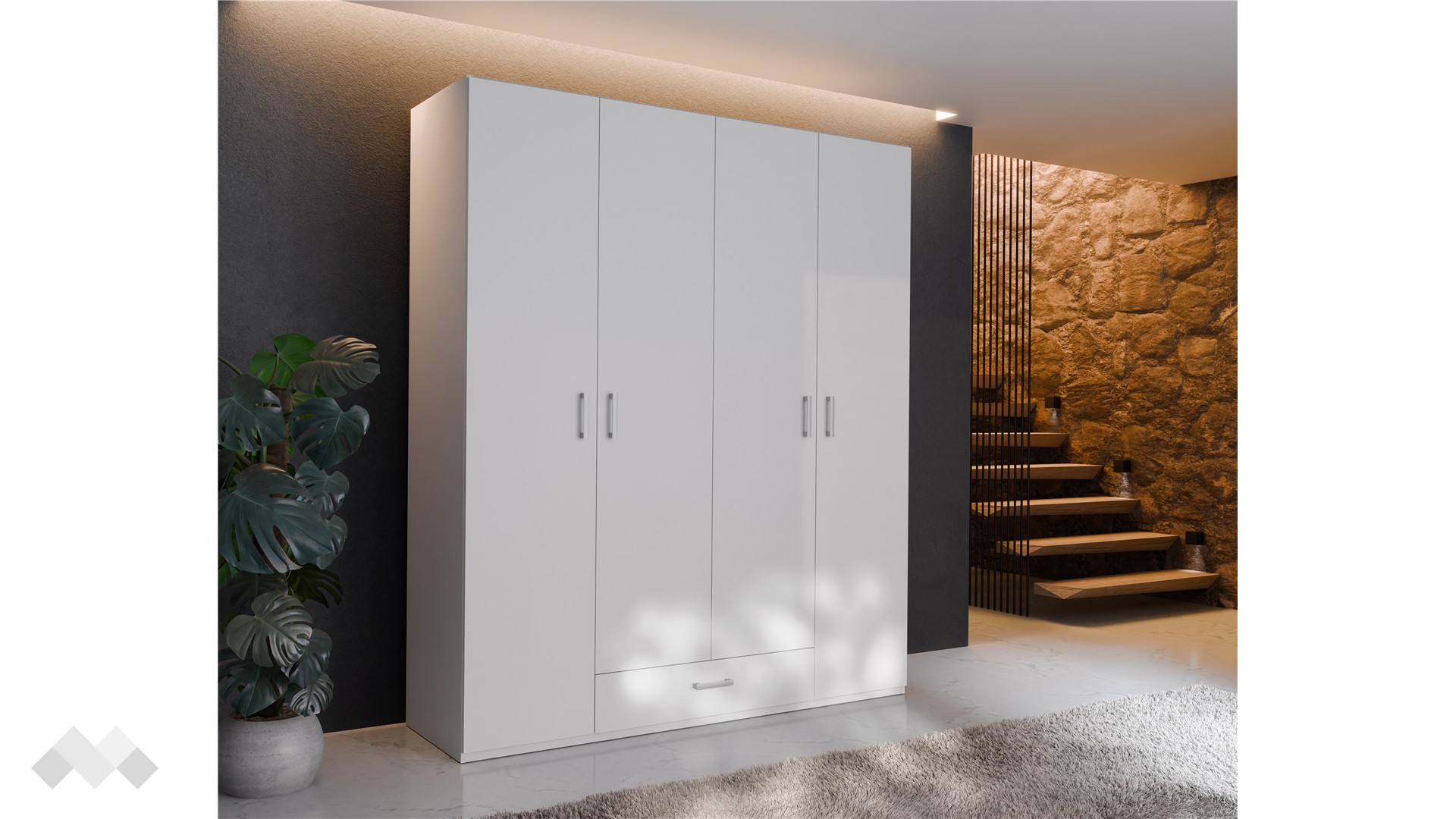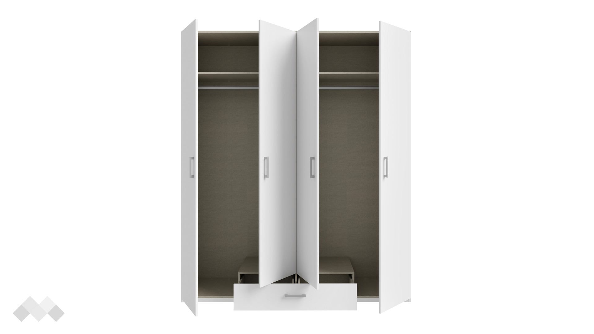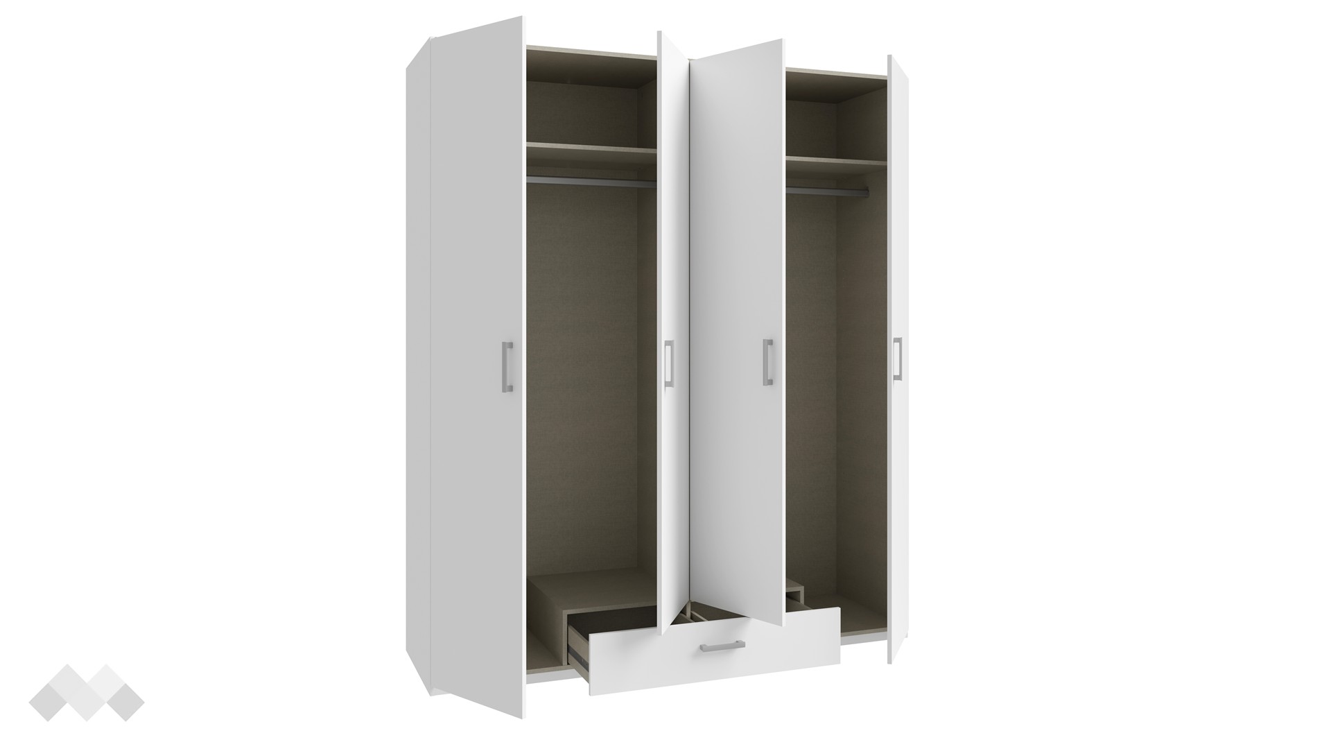 ⭐ Предимства: ✓ четирикрилен ✓ чекмедже ✓ 2 рафта ✓ 2 лоста за закачалки ✓ практично разпределение ✓ качествена изработка ✓ 16 мм ПДЧ