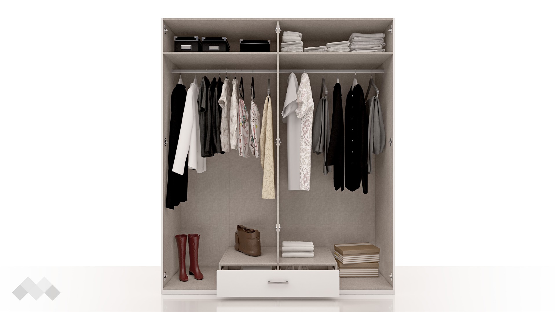 На твое разположение са два лоста за закачалки, където можеш да съхраняваш ризи, сака или палта. Гардеробът е с два рафта, на които можеш да организираш сгънати дрехи, хавлии, завивки или аксесоари. За още по-голямо удобство сме добавили и просторно чекмедже, подходящо за съхранение на бельо, чорапи или дребни принадлежности.