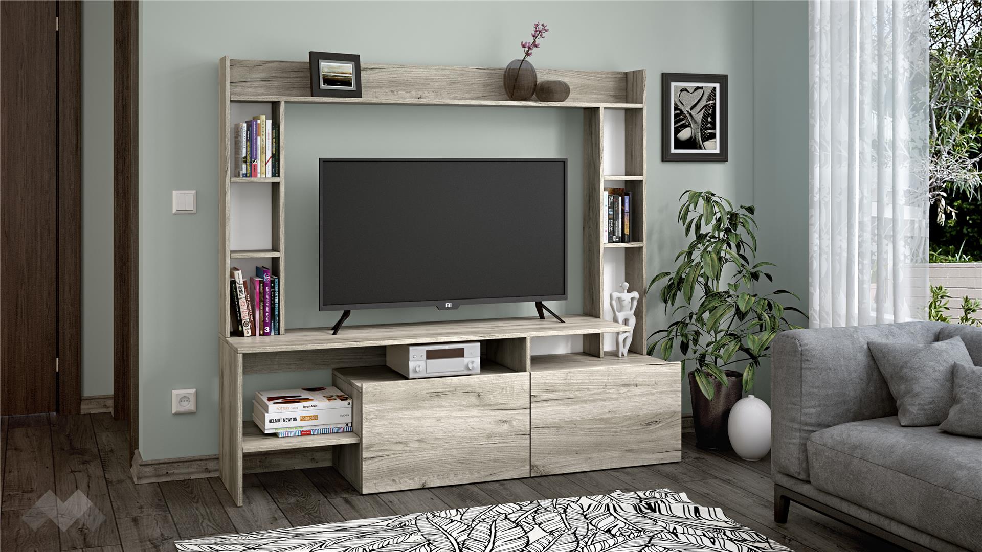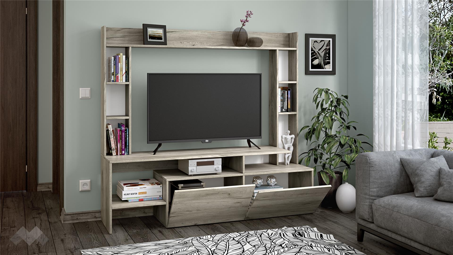 ⭐ Предимства: ✓ място за ТВ 120/40/80 см ✓ 9 открити рафта ✓ 2 затворени шкафа ✓ модерен дизайн ✓ компактен и практичен ✓ качествена изработка ✓ 16 мм ПДЧ