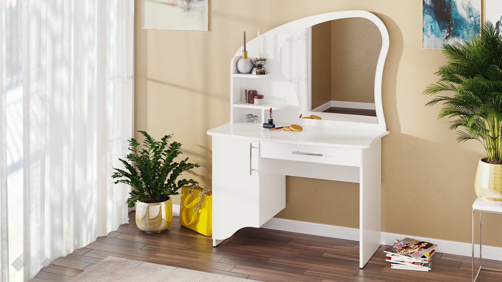 Тоалетката разполага с 1 чекмедже и 1 шкаф, които предлагат практично съхранение за гримове, аксесоари и други лични вещи. Двете малки рафтчета са идеални за подреждане на декоративни елементи или най-често използваните козметични продукти, осигурявайки лесен достъп и подреден вид.