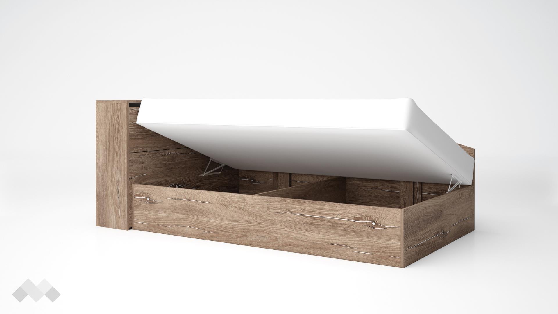 Включеният повдигащ механизъм предоставя лесен достъп до просторна подматрачна зона, перфектна за съхранение на спално бельо, сезонни дрехи и други вещи, които трябва да бъдат лесно достъпни. Леглото е изработено от висококачествено 16 мм ПДЧ, което гарантира дълготрайност и стабилност.