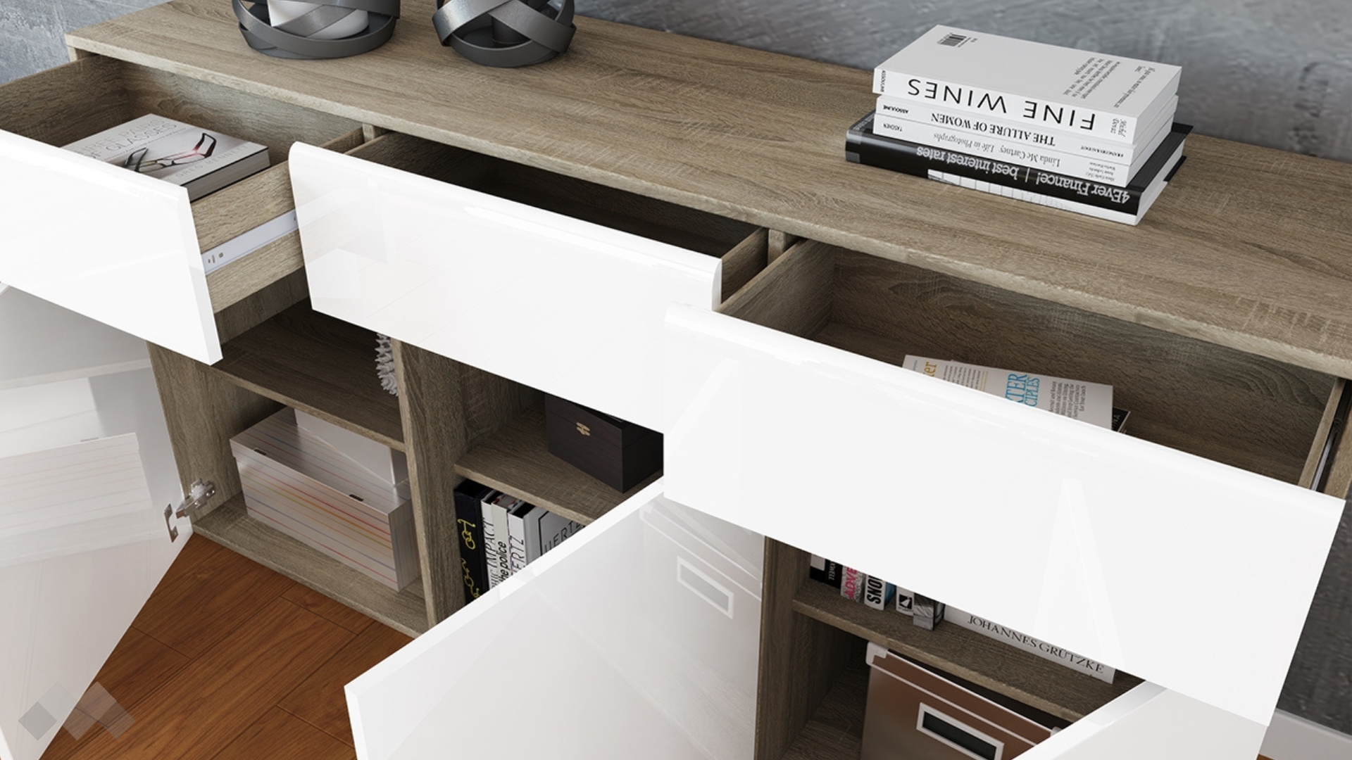 Снабден е с три чекмеджета и три шкафа за по-практична подредба. Включен е и механизъм за плавно затваряне на вратичките за твое по-голямо удобство. Скринът чудесно си подхожда с витрина и маса Бос, с които да създадеш перфектната комбинация за твоята трапезария.