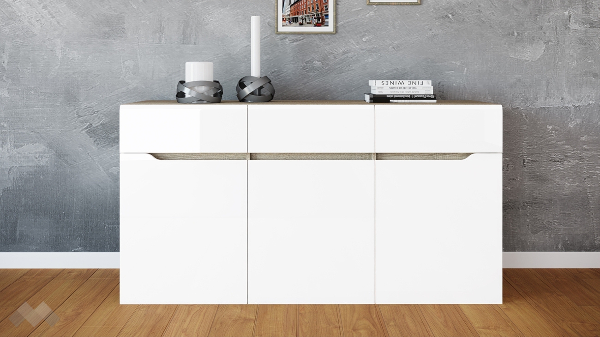 Изработен е от 16 мм ламинирано ПДЧ и 18 мм МДФ за по-голяма здравина и стабилност. Цветовата комбинация е семпла - лице в бяло гланц с корпус в дъб сонома.
