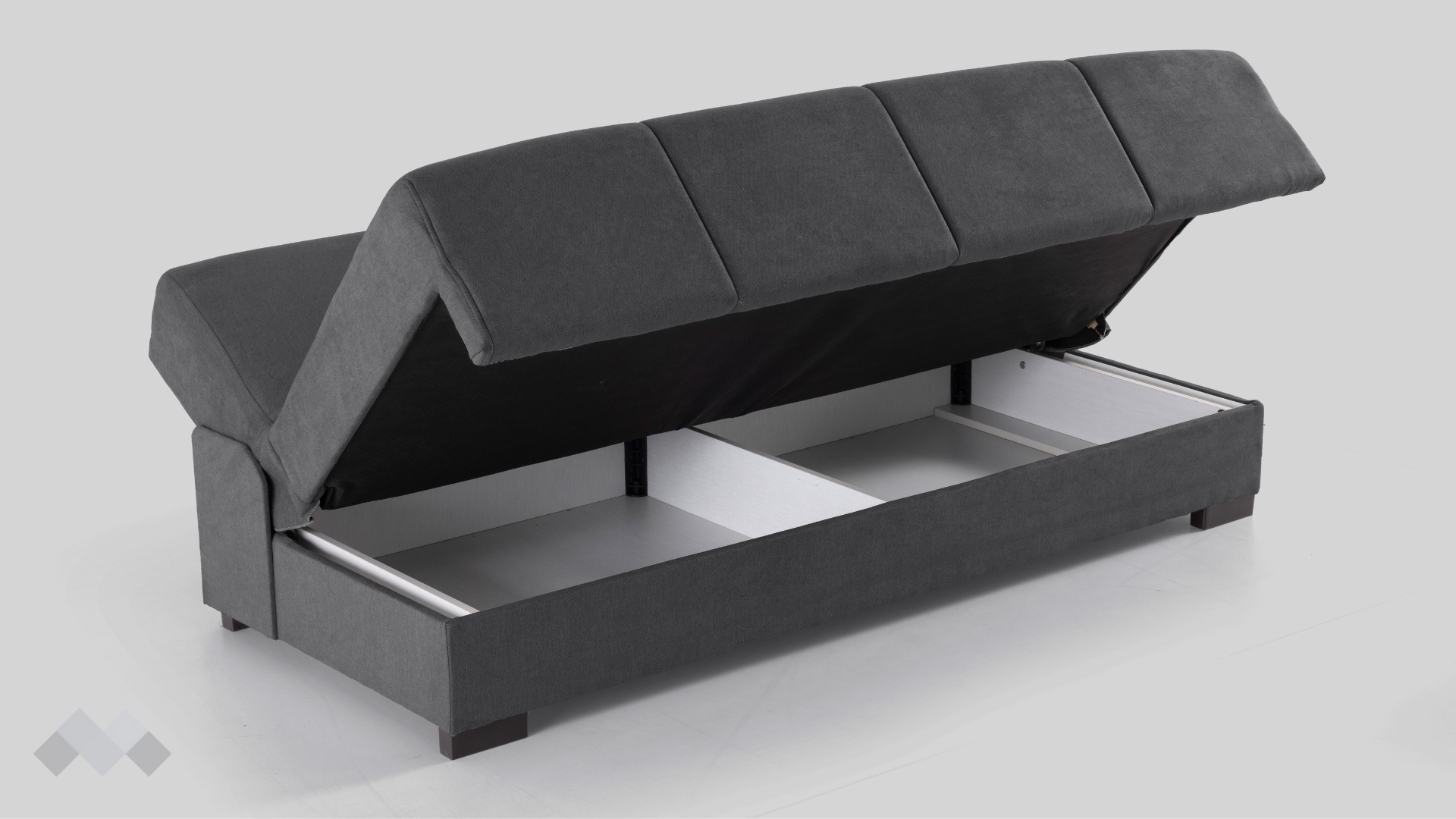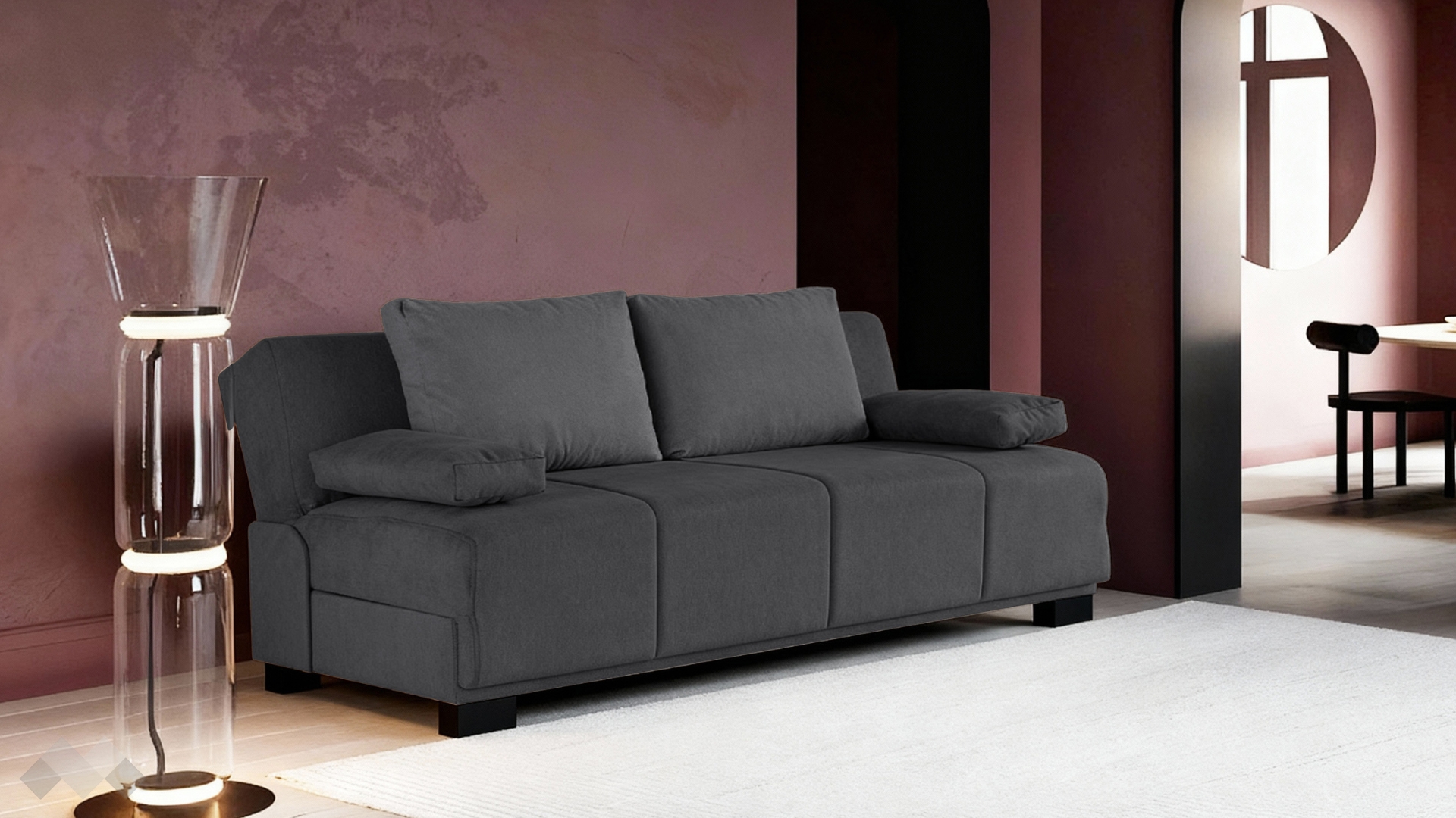 Канапето разполага с удобни възглавници за подлакътници, които осигуряват допълнителна опора при седене и могат лесно да се премахнат, за да се освободи повече пространство за отдих. Под меката седалка ще откриеш практична ракла – идеална за съхранение на одеяла, възглавници или други домашни принадлежности. А когато имаш нужда от легло, само с едно движение трансформираш канапето в удобна площ за сън, благодарение на лесния за използване клик-клак механизъм.