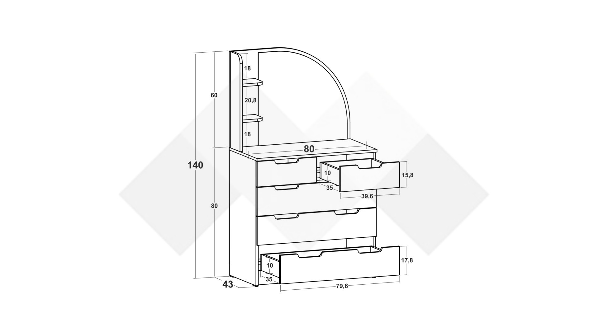 ✓ огледало ✓ 5 чекмеджета ✓ 2 малки рафтчета ✓ практичен и елегантен дизайн ✓ качествена изработка ✓ 16 мм ПДЧ