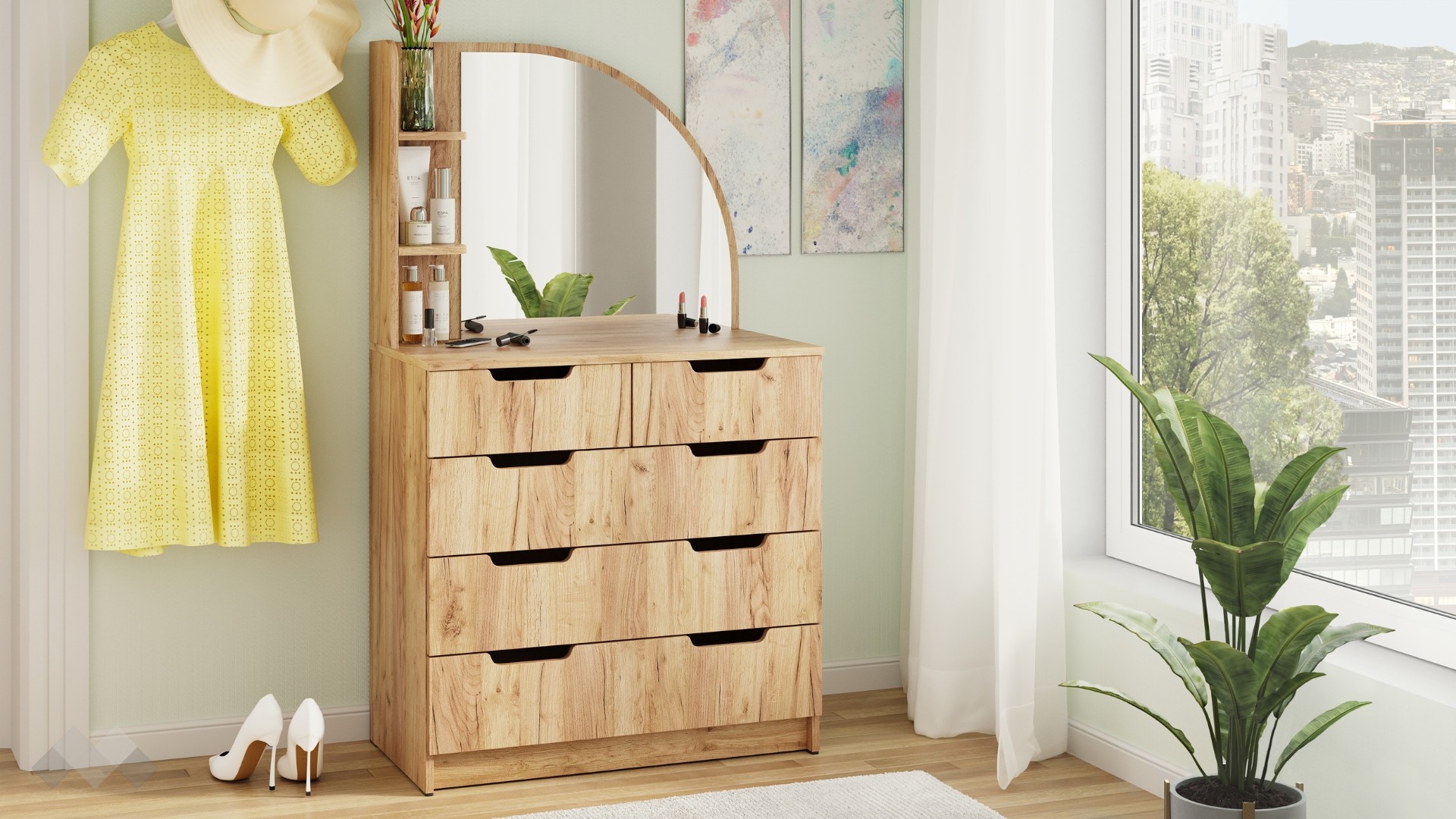 ⭐ Предимства: ✓ огледало ✓ 5 чекмеджета ✓ 2 малки рафтчета ✓ практичен и елегантен дизайн ✓ качествена изработка ✓ 16 мм ПДЧ