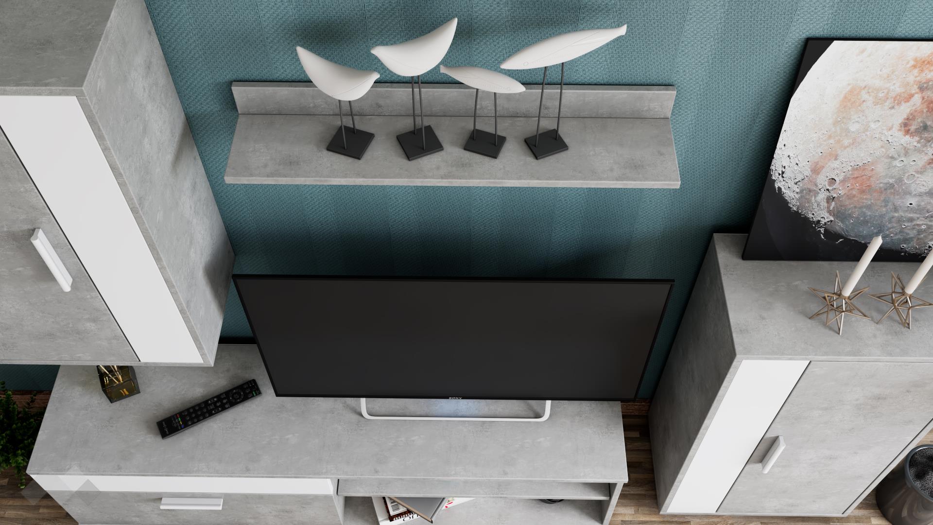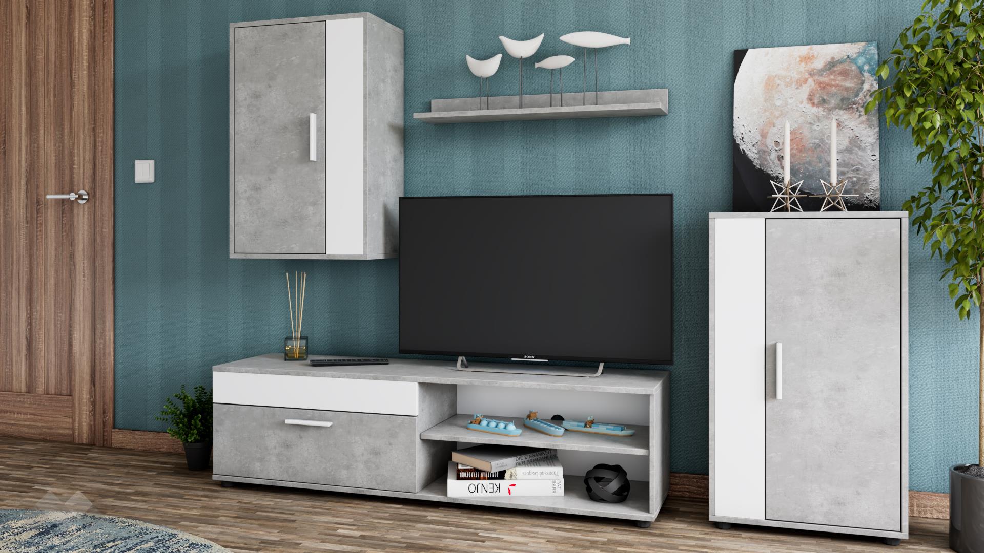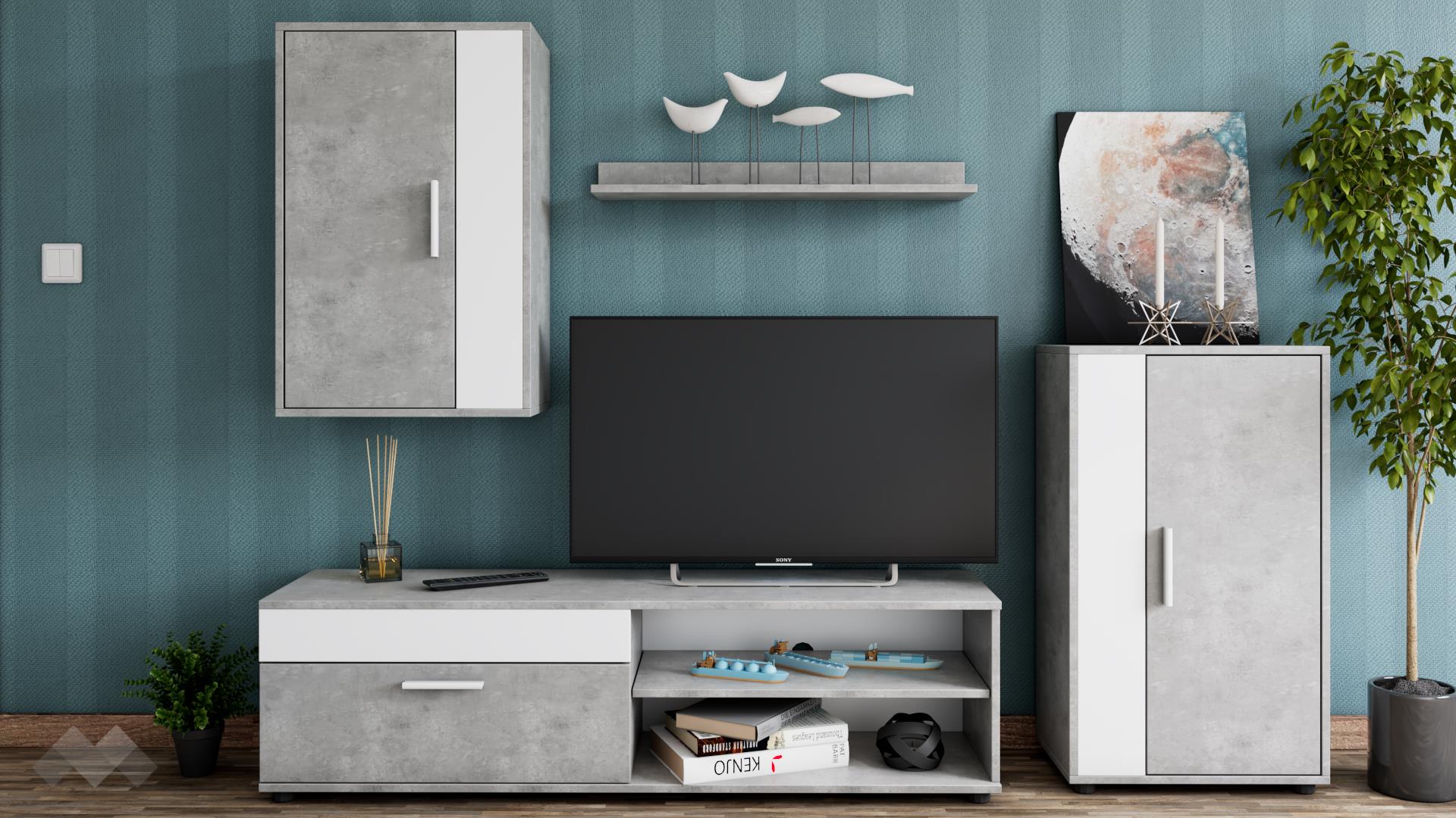 ⭐ Предимства: ✓ 2 отворени рафта ✓ ТВ шкаф ✓ висок шкаф ✓ окачен шкаф ✓ етажерка ✓ модерен дизайн ✓ функционална и практична ✓ качествена изработка ✓ 16 мм ПДЧ