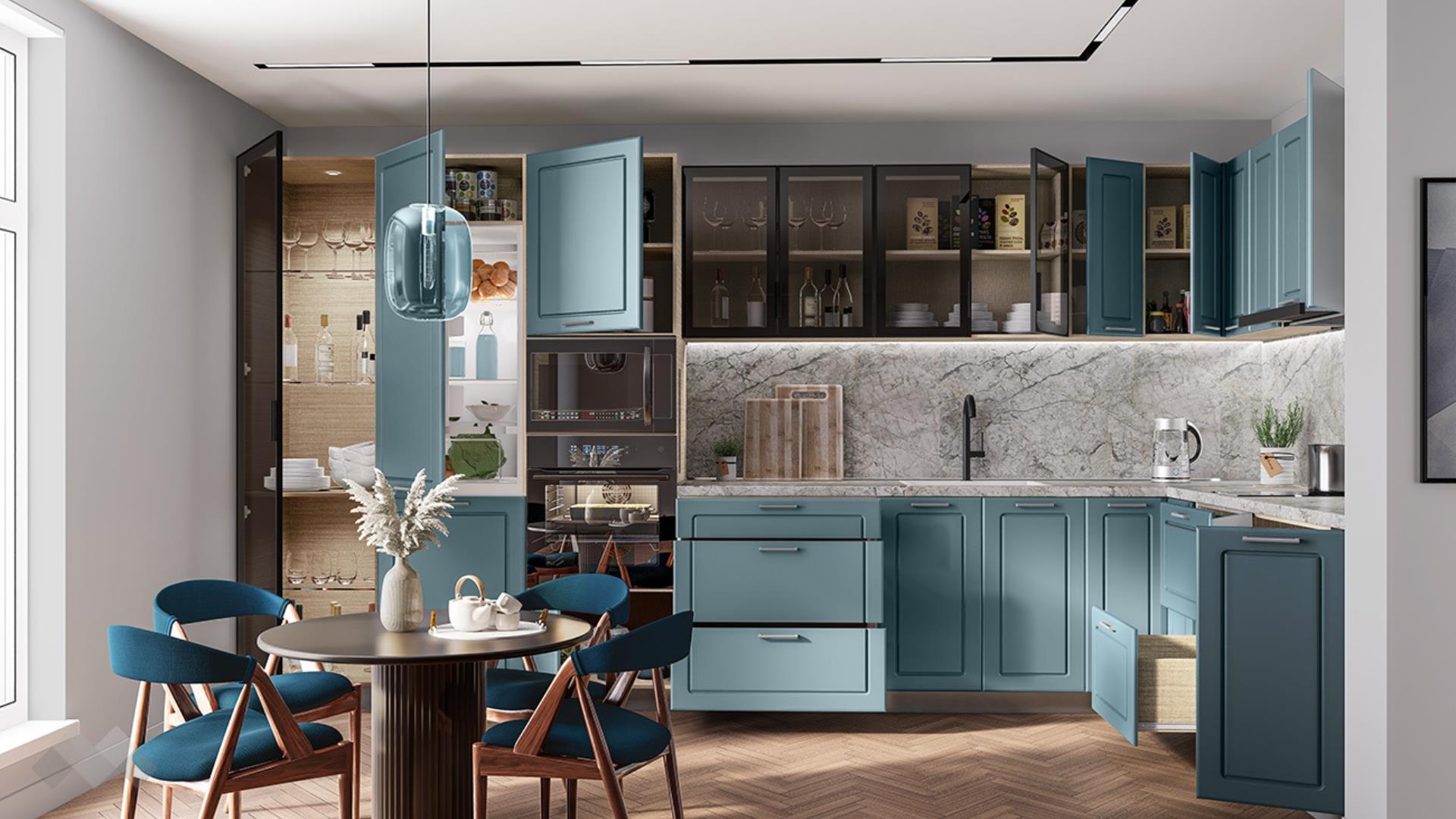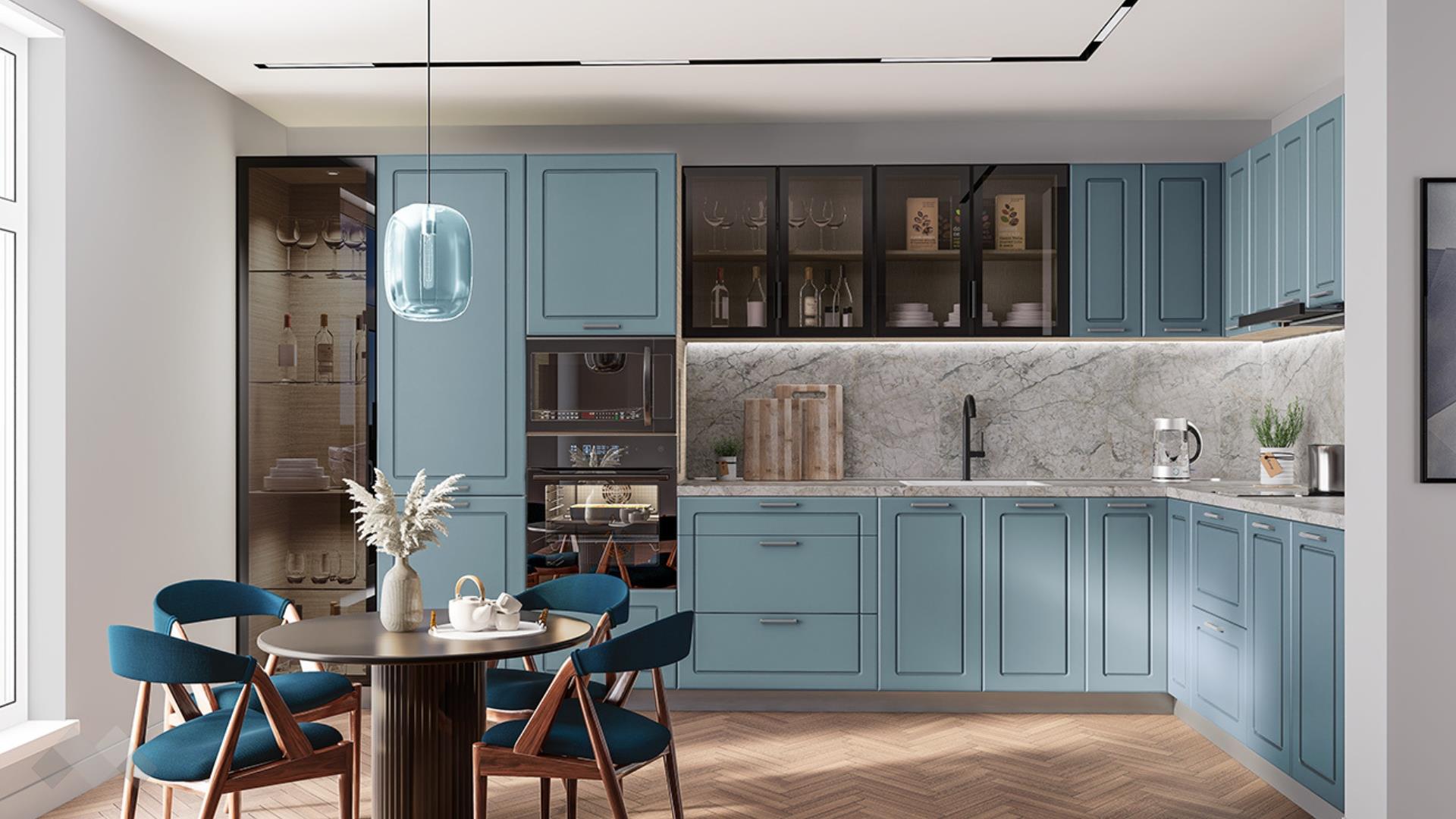 Страхотната модерна комбинация между корпус мока и лице деним мат, придава на кухнята характер и уют.