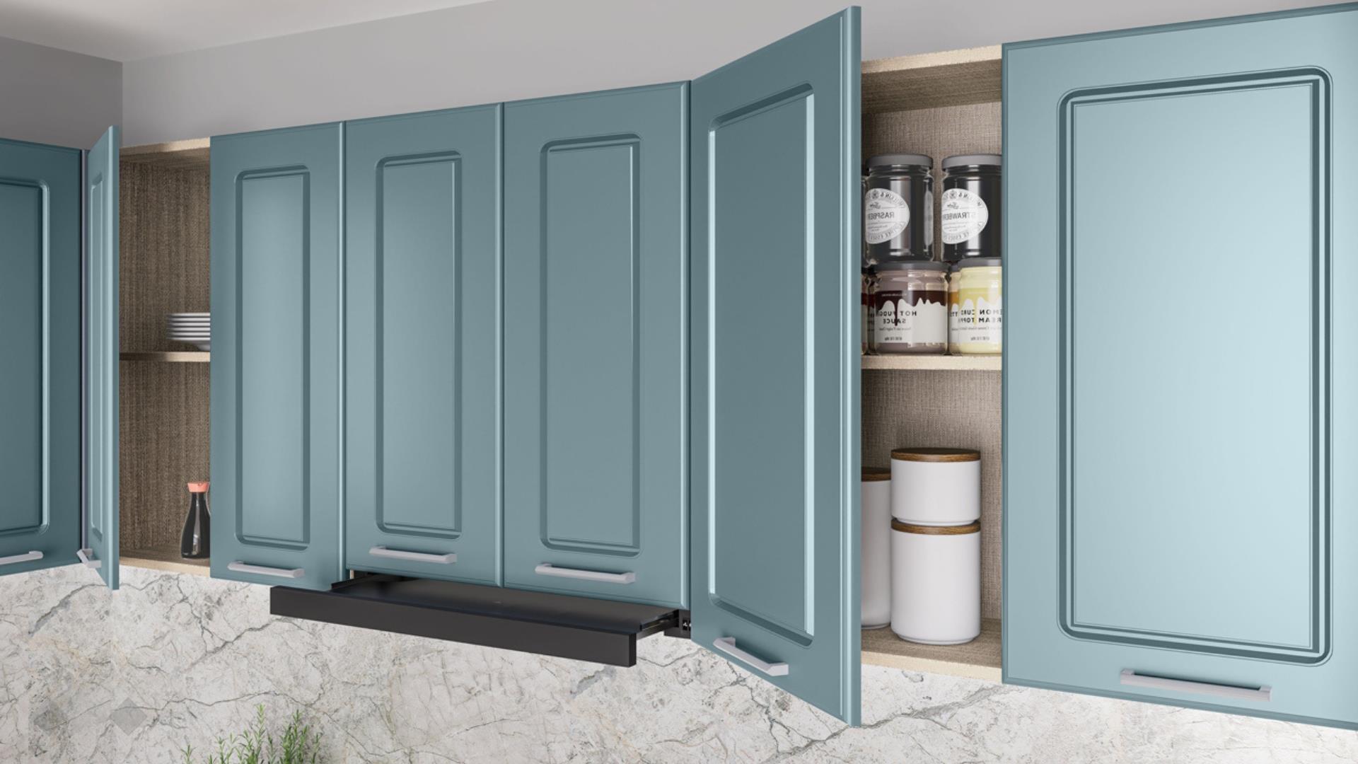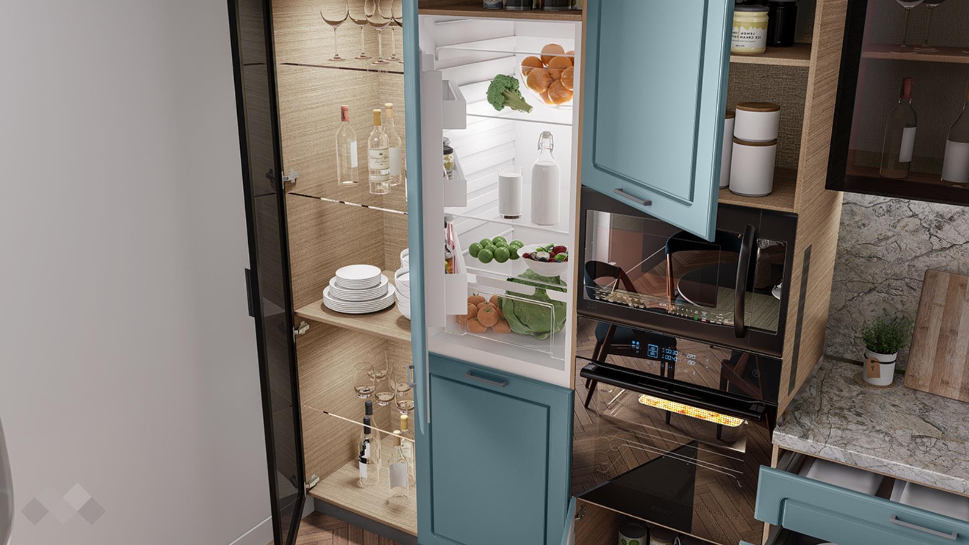Горния ред шкафове са достатъчно на брой и големина, че да поберат както малко използваните уреди, така и тези, които използваш всчки ден. Шкаф стандартен размер за вграждане на хладилник - за да бъде всичко в синхрон. Шкаф за вграждане на фурна и микровълнова. Долния ред шкафове е функционално подбран - перфектната комбинация на рафтове и чекмеджета, за да поберат често използваните уреди, подправки и посуда. Витринния шкаф е с опушени матови стъкла 4 мм., 4 рафта и LED осветление, за да изглежда още по-елегантно.