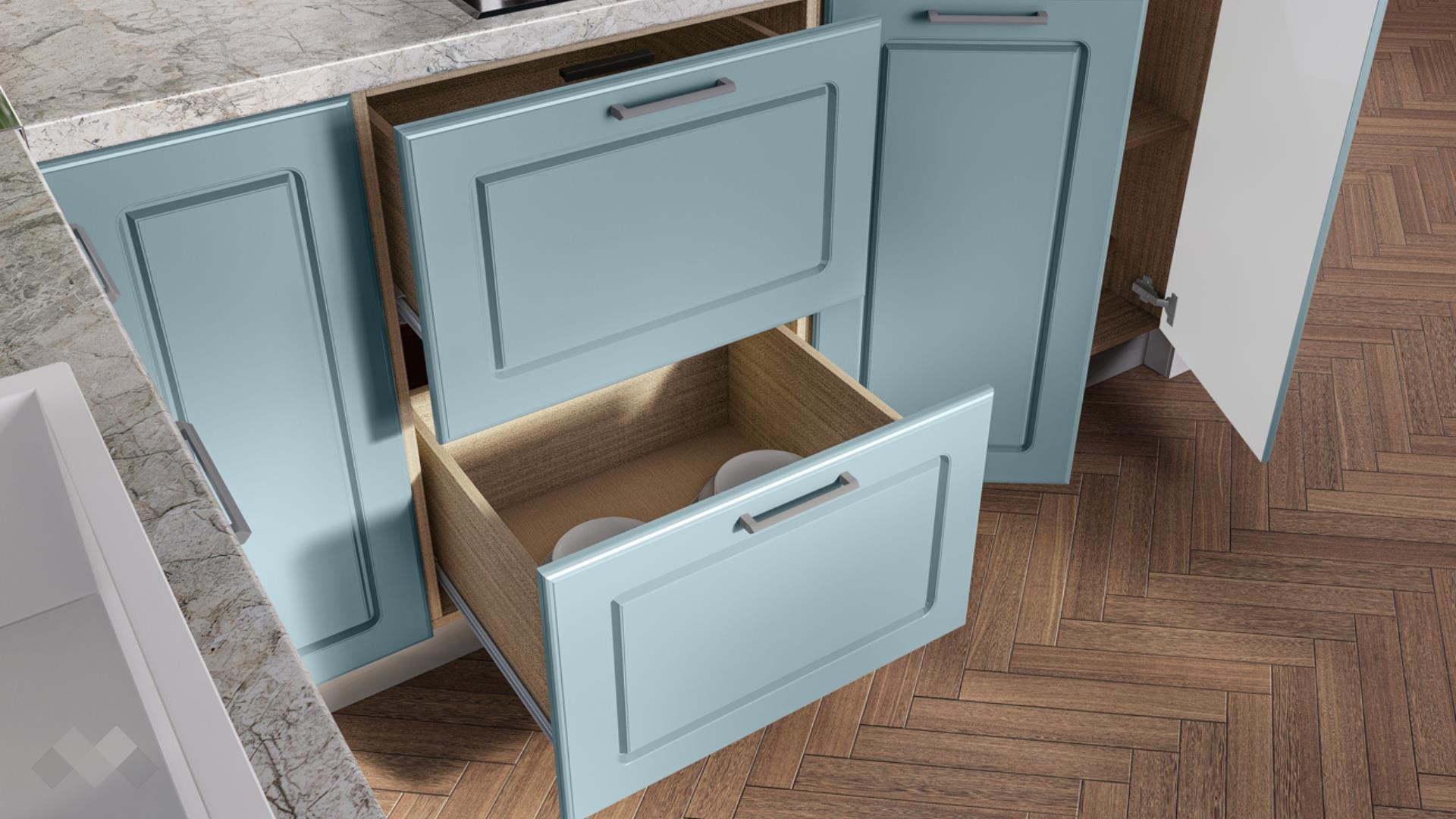 Кухнята е изработена от 16 мм ПДЧ корпус и 18 мм фолиран МДФ. Предимството на фолирания МДФ е, че материалът покрива цялата повърхност, включително и кантовете на детайла, т.е. материалът е облечен изцяло. Термоплотът идва при теб цял, за да можеш да го пригодиш спрямо твоите предпочитания и е в цвят Небула. Всички врати и чекмеджета са с механизъм за плавно затваряне.