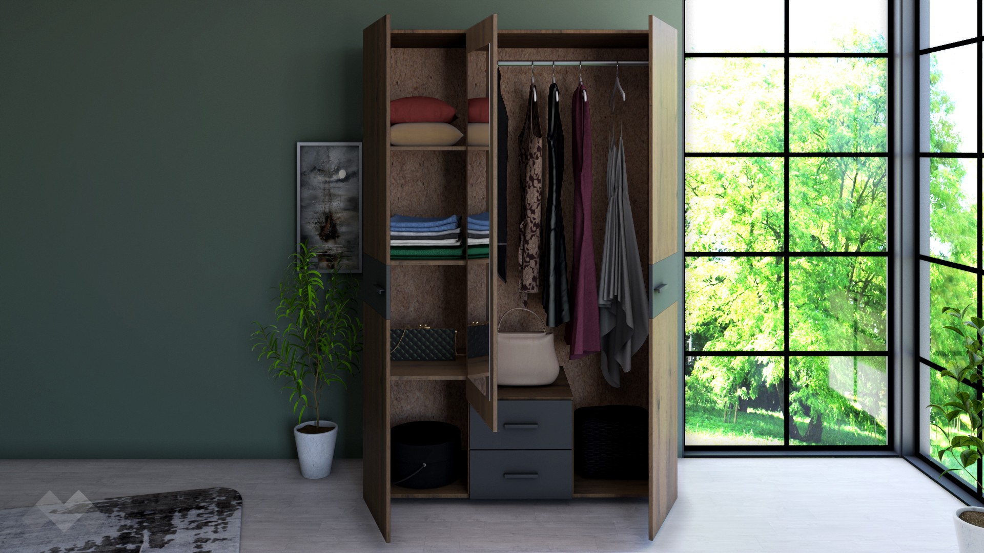 Разпределението на гардероба е отлично – предлага ти крило с 3 рафта за дрехите, които съхраняваш сгънати, лост за закачалки и две чекмеджета подходящи за бельо или аксесоарите ти.