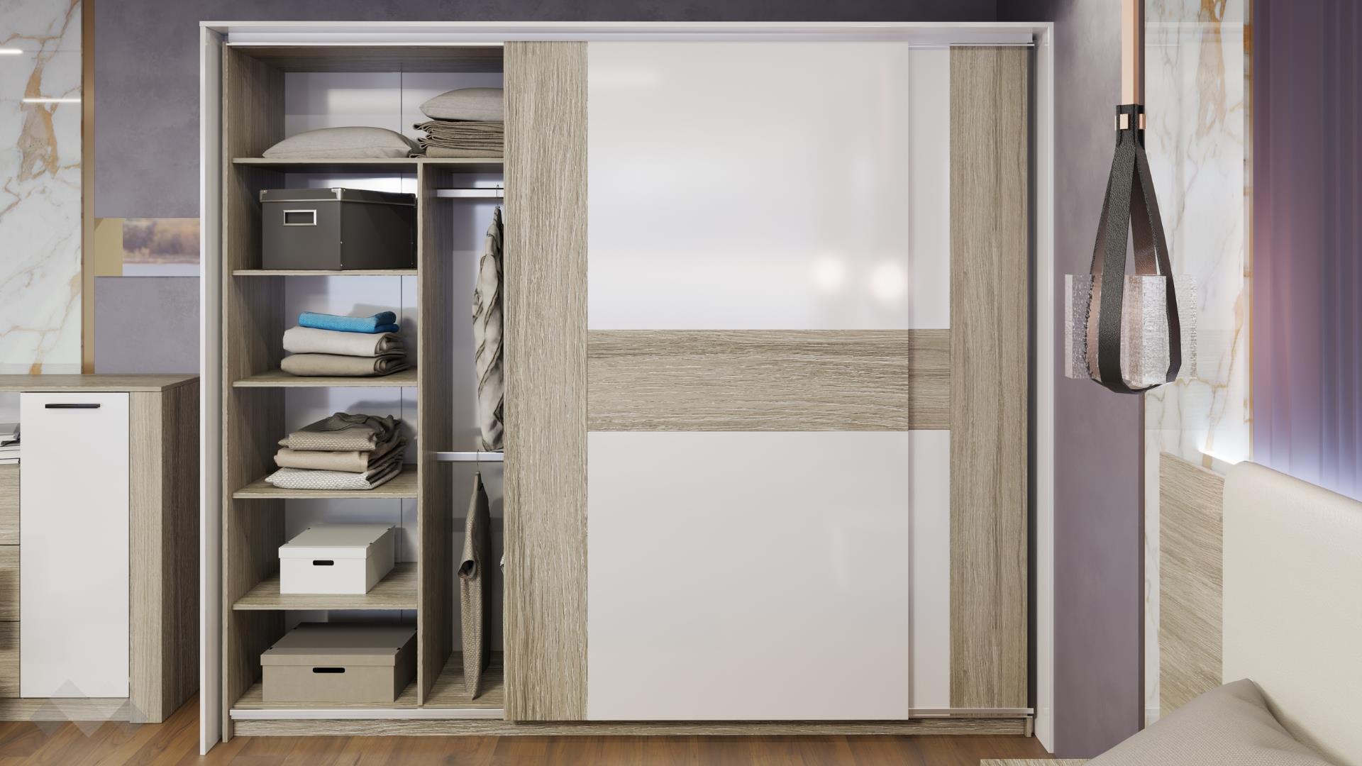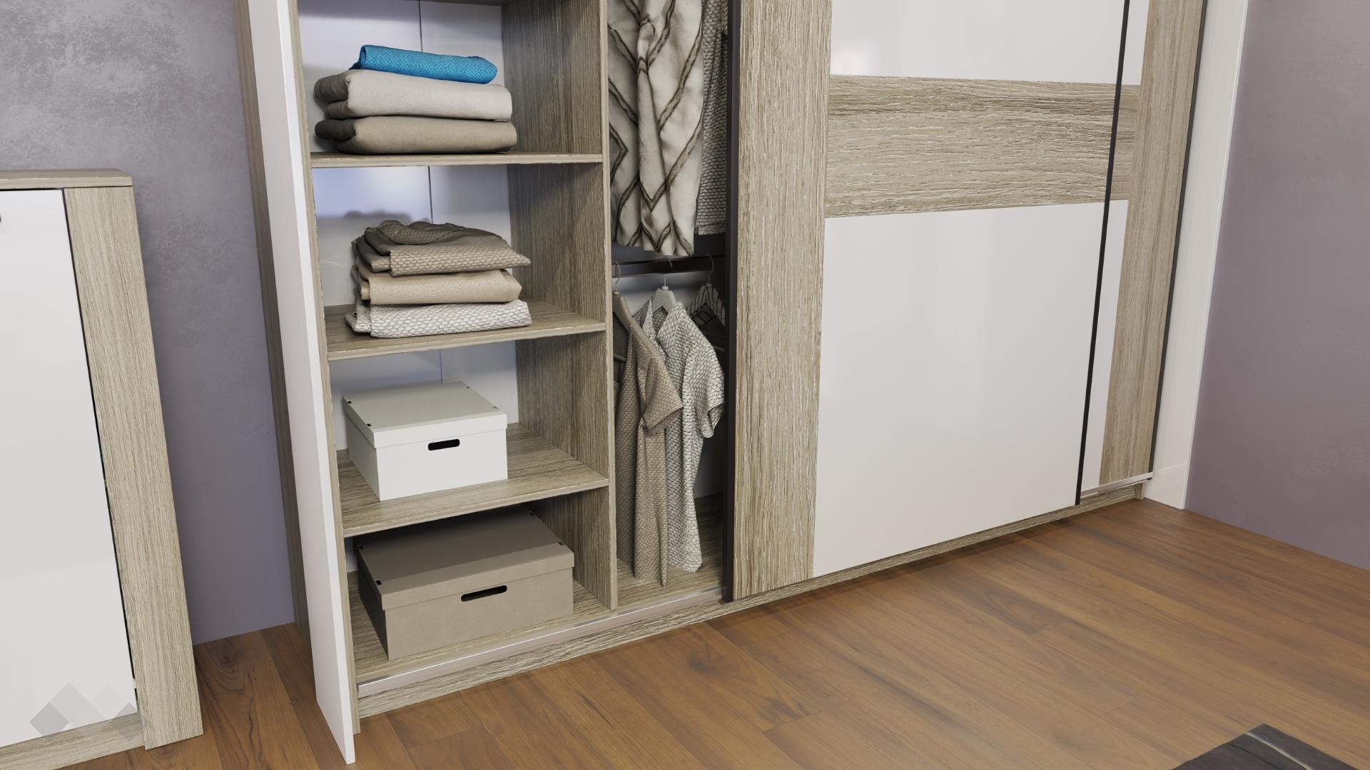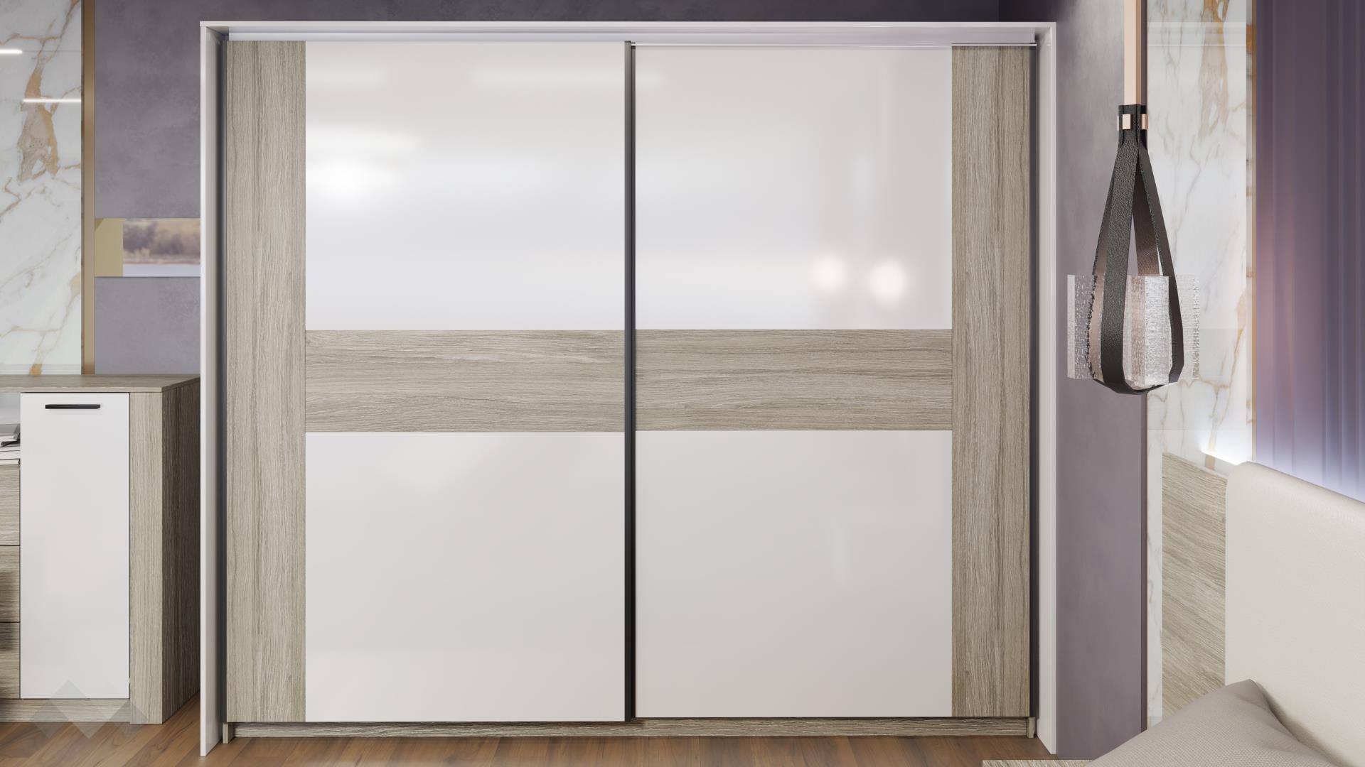 Гардеробът с плъзгащи врати впечатлява със стилния си дизайн, внушителните размери и практичното разпределение. Паспарту рамката, характерна за луксозните гардероби, придава изисканост, а плъзгащите врати ти осигуряват удобство и спестяват пространство. С дължина почти 250 см и височина 210 см, този гардероб предоставя достатъчно място, съобразено с твоите нужди.