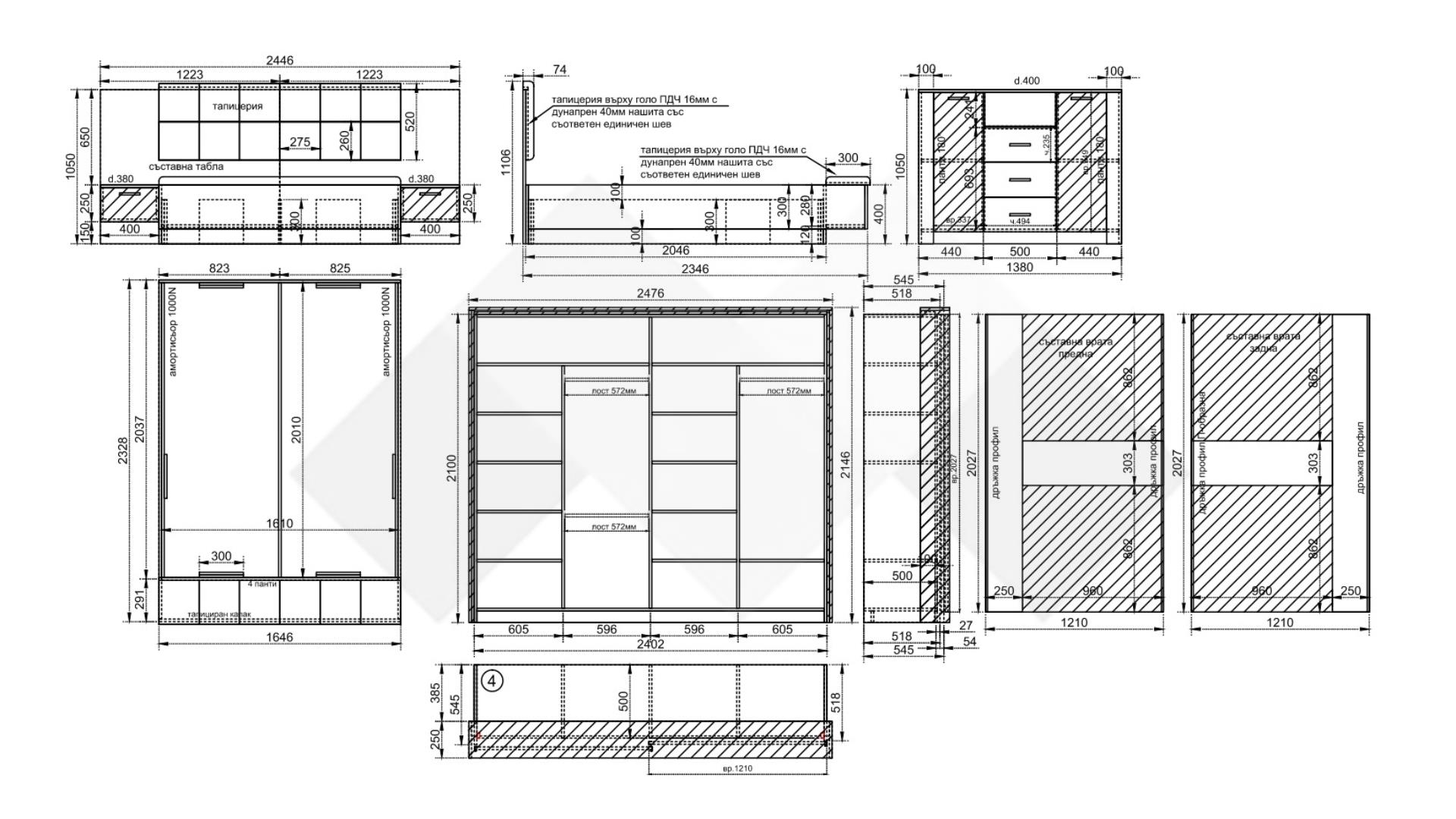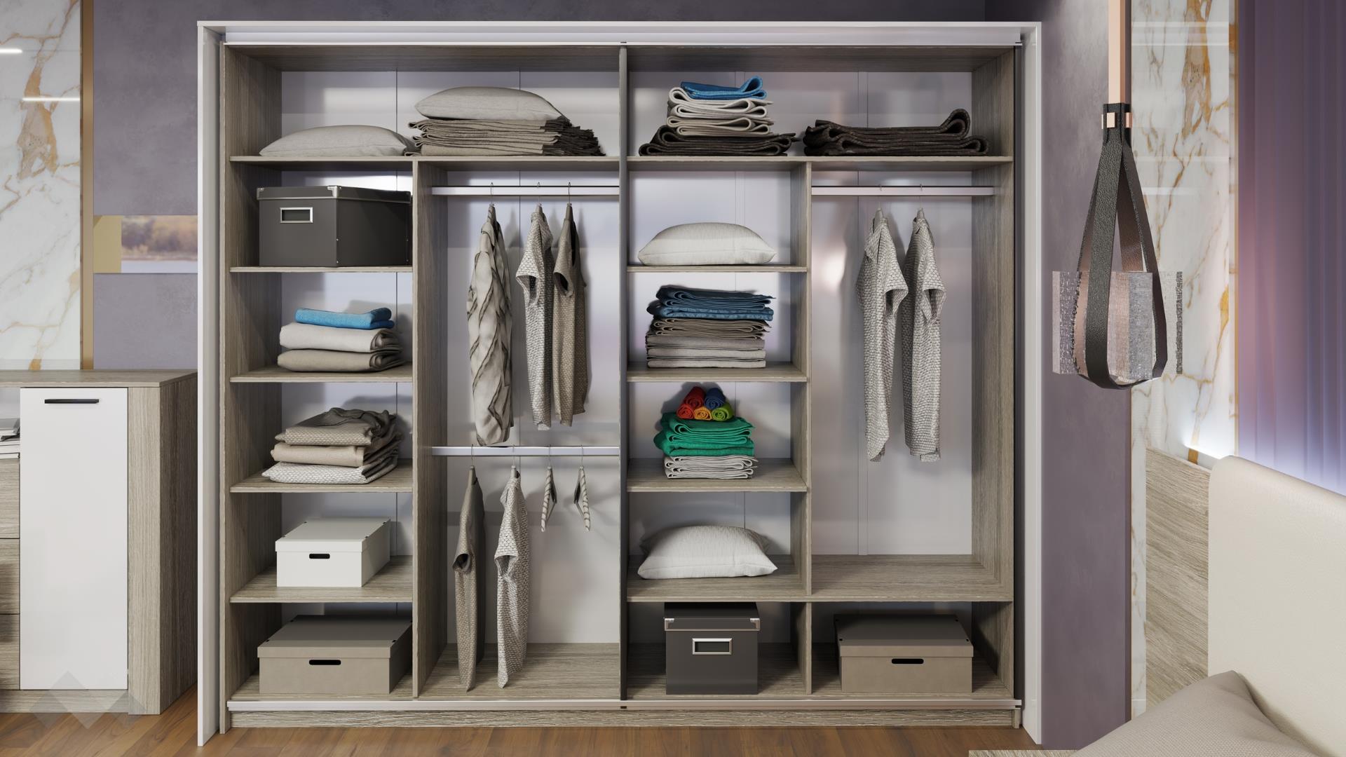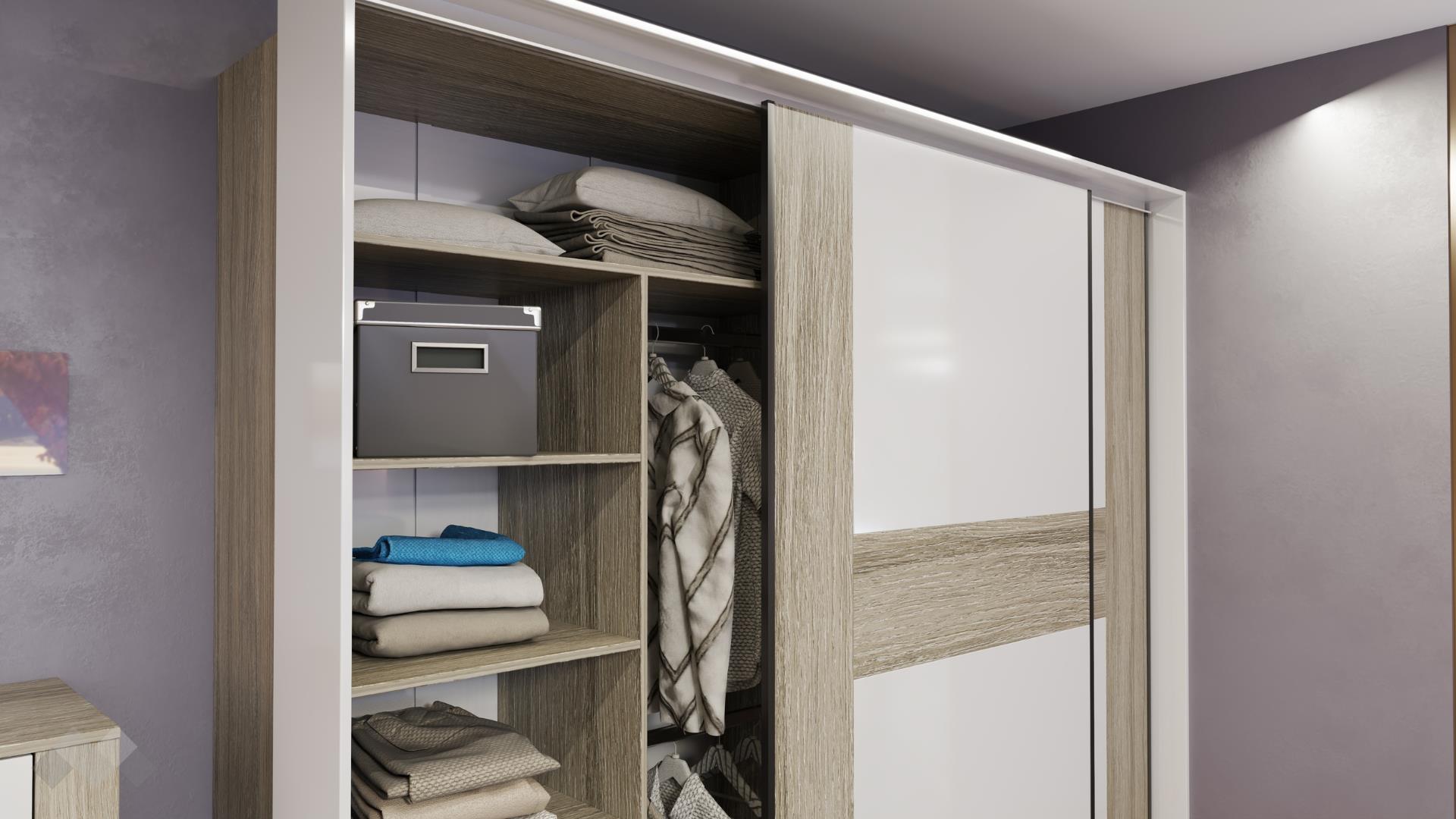 Гардеробът с плъзгащи врати впечатлява със стилния си дизайн, внушителните размери и практичното разпределение. Паспарту рамката, характерна за луксозните гардероби, придава изисканост, а плъзгащите врати ти осигуряват удобство и спестяват пространство. С дължина почти 250 см и височина 210 см, този гардероб предоставя достатъчно място, съобразено с твоите нужди.