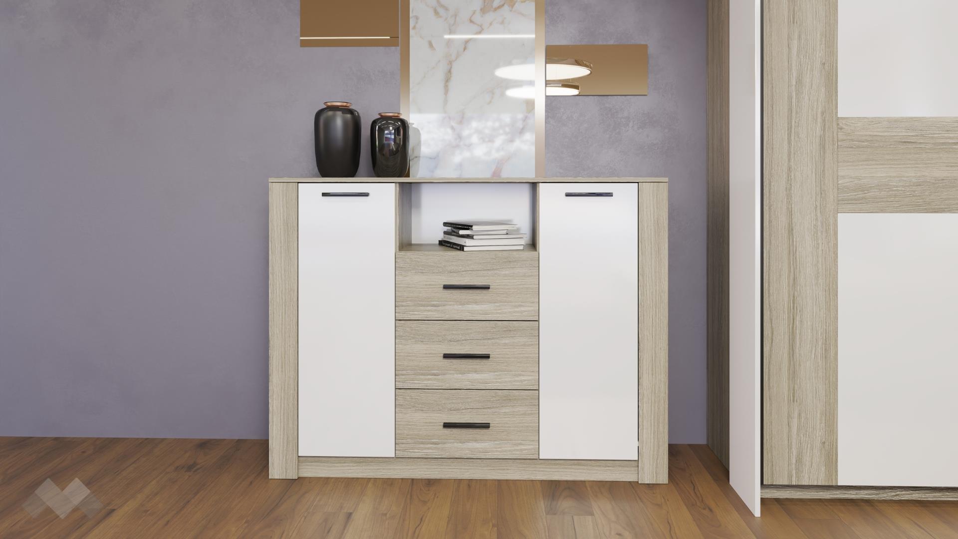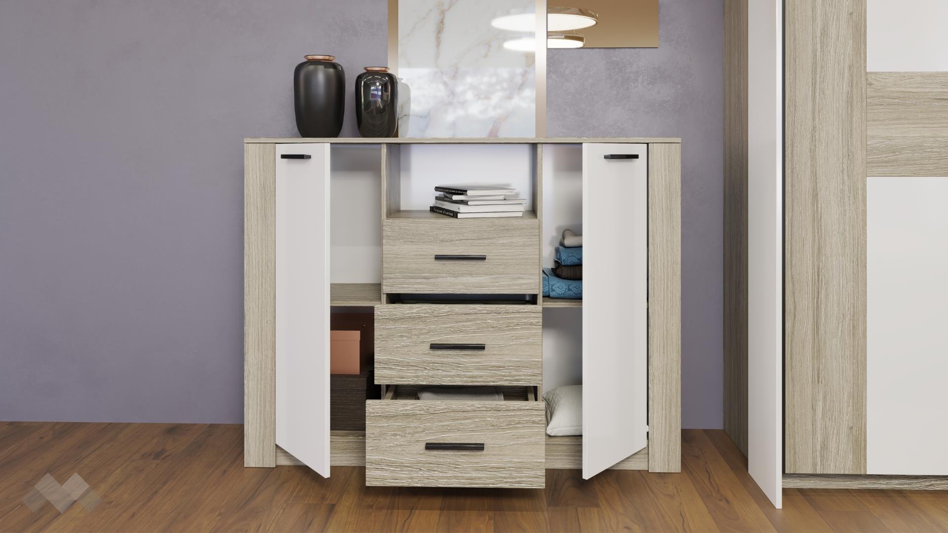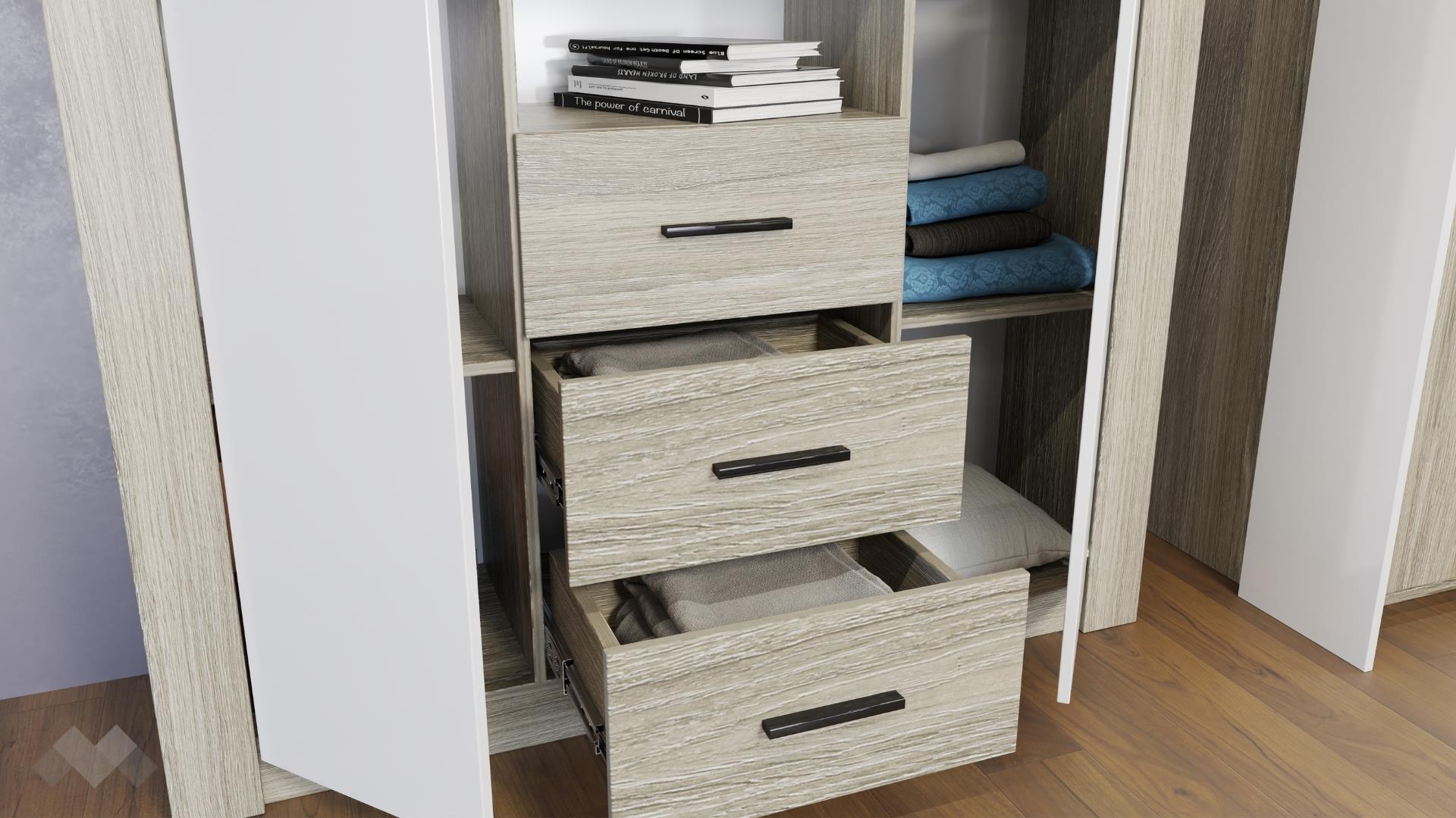 Скринът комбинира удобство, функционалност и здравина. С размери, равняващи се на половин стандартен трикрилен гардероб, той ти предлага много място за съхранение. Трите чекмеджета с телескопични съчмени водачи осигуряват пълно изтегляне и лесен достъп до вещите, а двете врати с механизми за плавно затваряне добавят комфорт и безшумност.