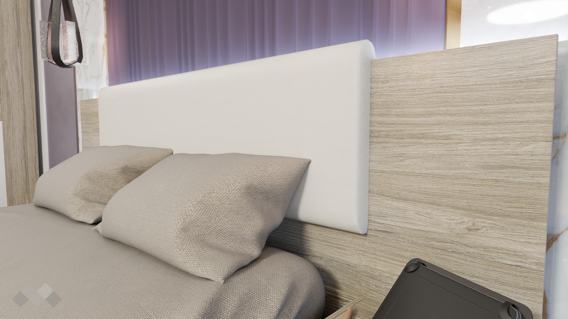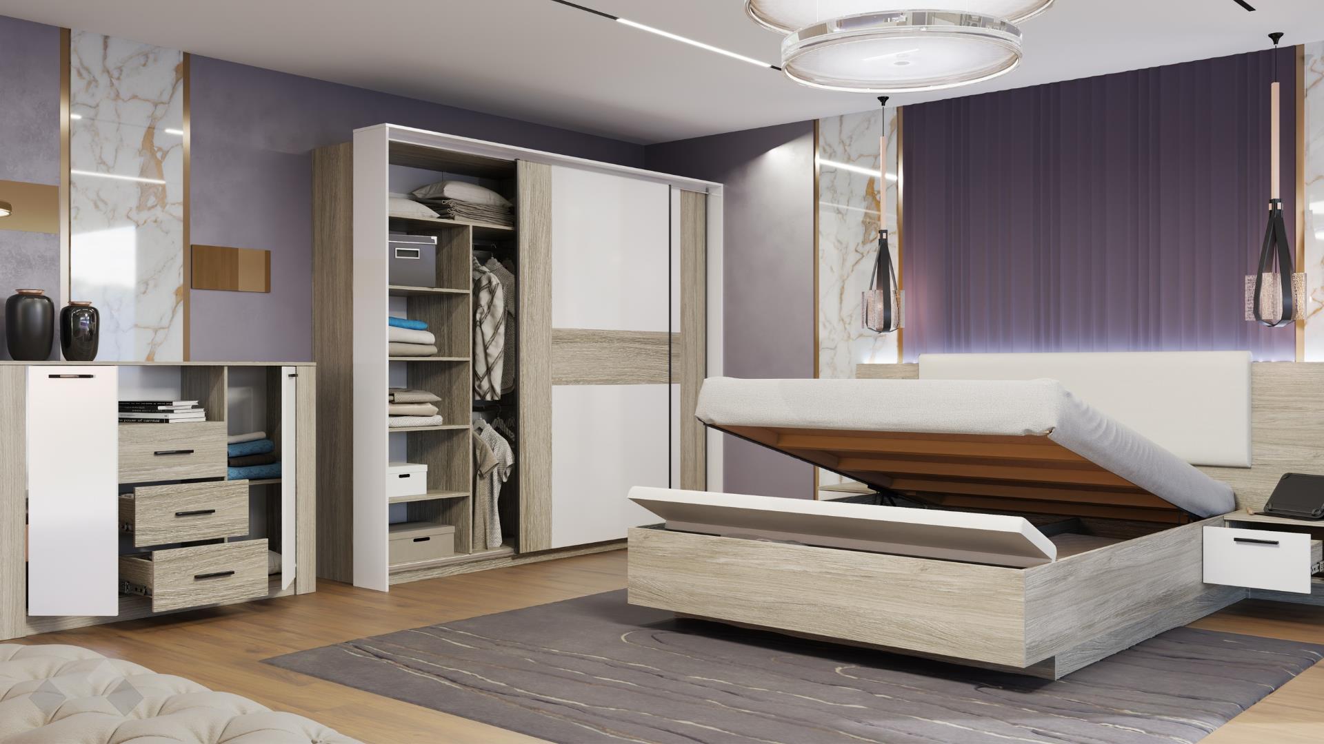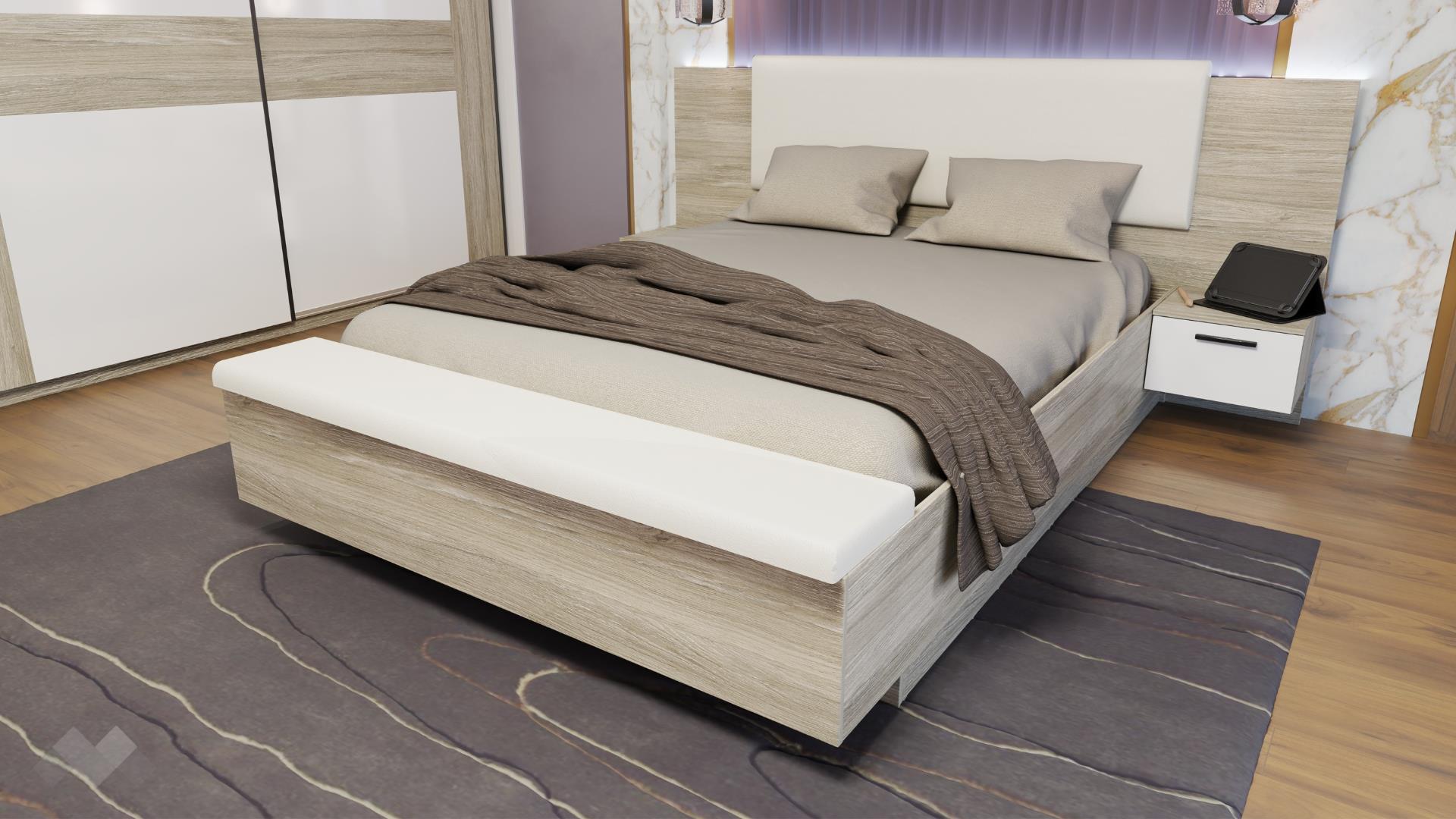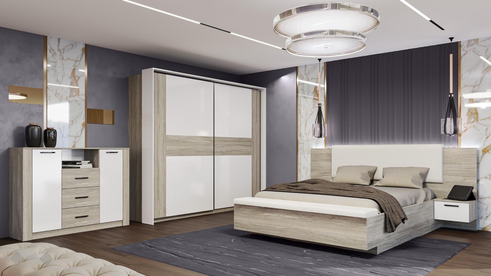 Спалнята е сърцето на този комплект – стабилна и проектирана с внимание към всеки детайл. Леглото е подходящо за матрак 160/200 см, а високите лубове, съчетани с матрака, осигуряват удобна височина за сядане от 51-53 см. Тапицираната табла от лесна за почистване еко кожа ти предоставя комфорт при четене или гледане на телевизия, като същевременно добавя елегантност към дизайна.
