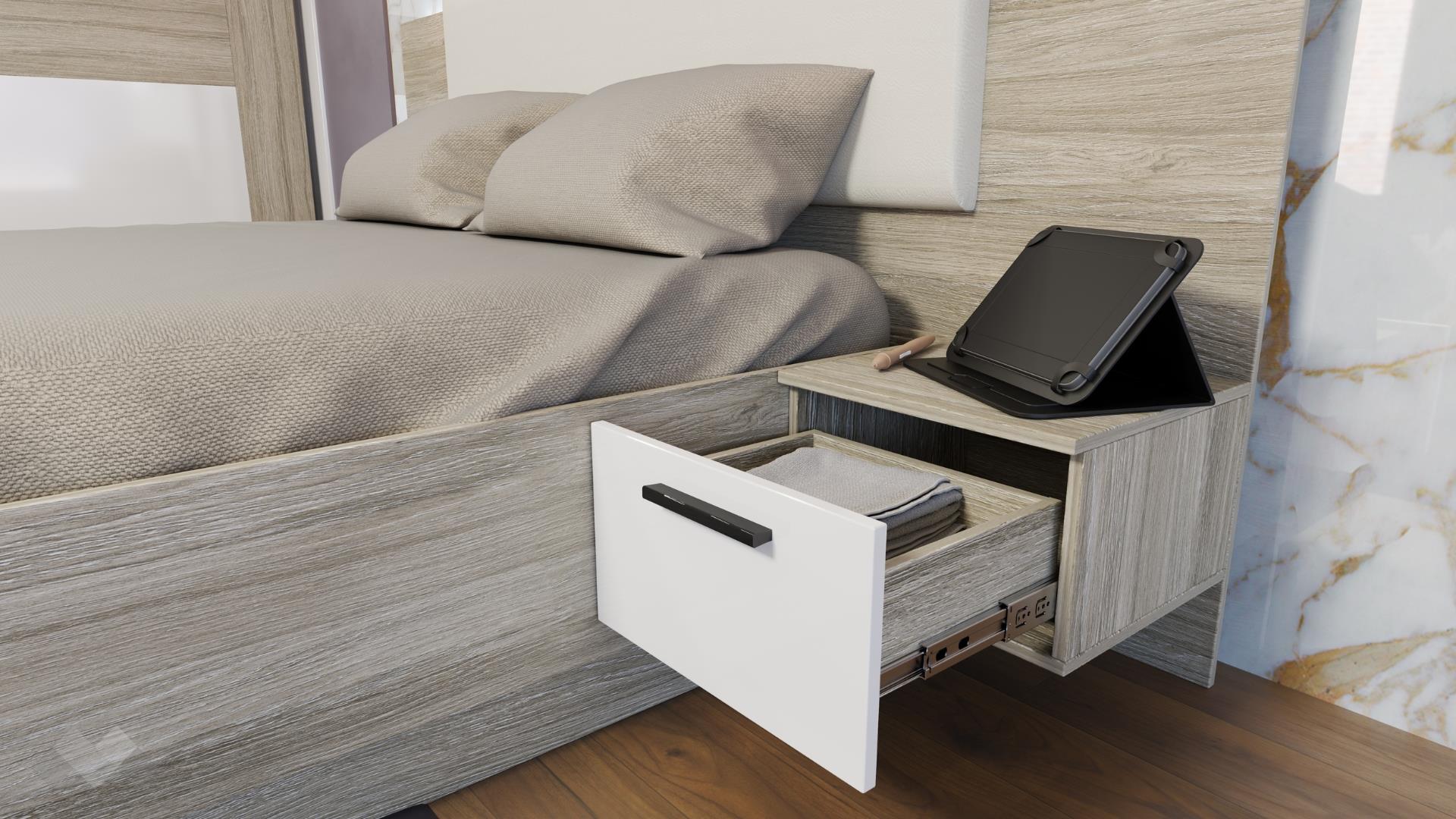 Нощните шкафчета завършват комплекта с елегантност и практичност. Всяко от тях разполага с чекмедже с механизъм за висока товароустойчивост, което гарантира надеждност и издръжливост.