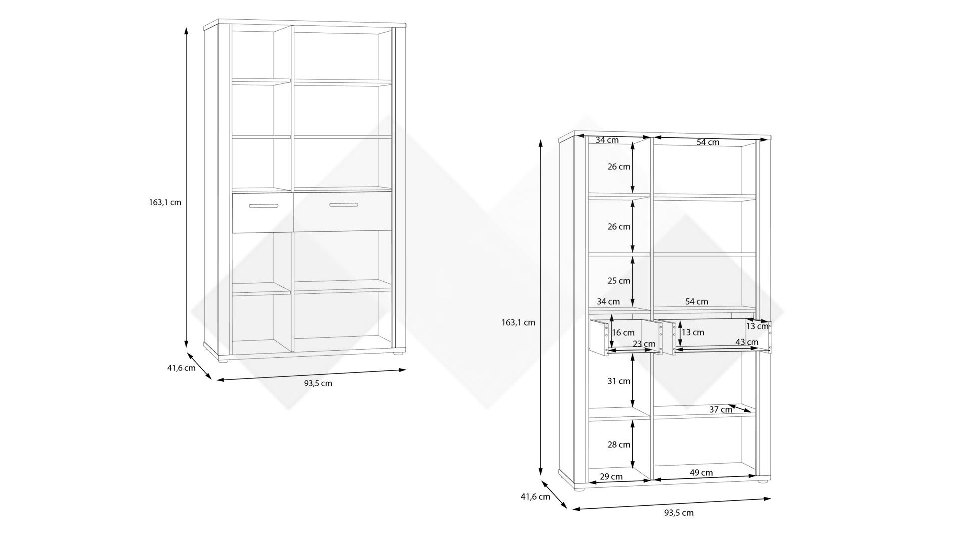 Шкафът е с впечатляващо разпределение – разполага с десет отворени рафта за лесен достъп и преглед на вещите ти, както и две удобни чекмеджета за съхранение на по-малки принадлежности. Компактните му размери позволяват да го разположиш дори в по-малки помещения, като същевременно осигурява изключително много място за организиране на вещите ти.