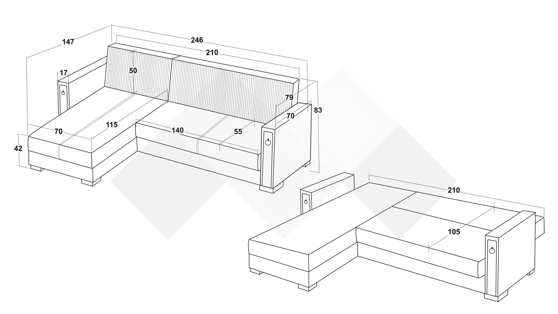 Освен стилен, Ъглов диван Дестини с унивесална посока е и функционален - с минимално усилие се превръща в комфортно и просторно легло с размери 105/210 см, благодарение на клик-клак механизъм. А под лежанката се крие просторна ракла, в която може да съхраниш завивки, още възглавници или вещи, които да са на една ръка разстояние.