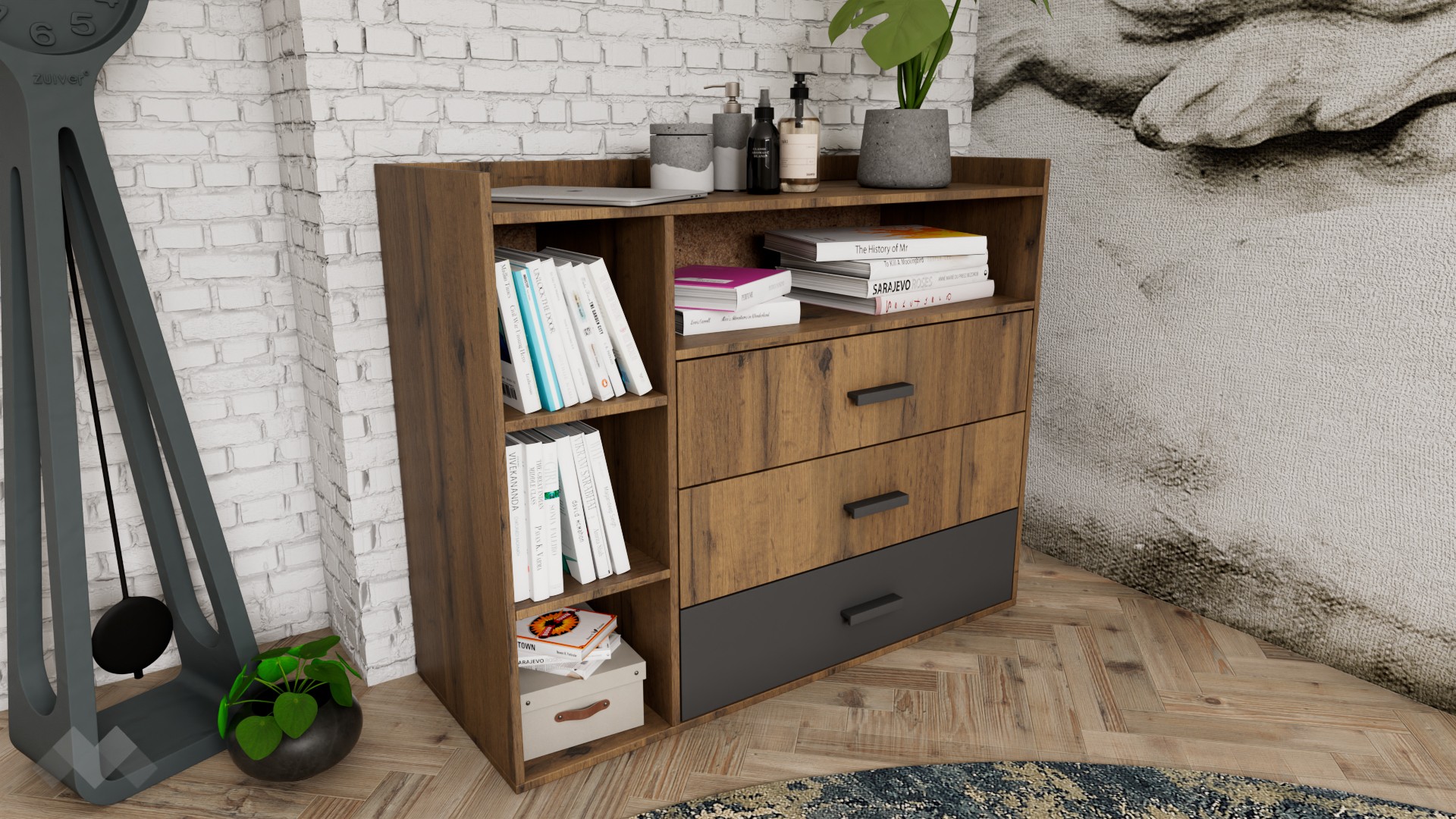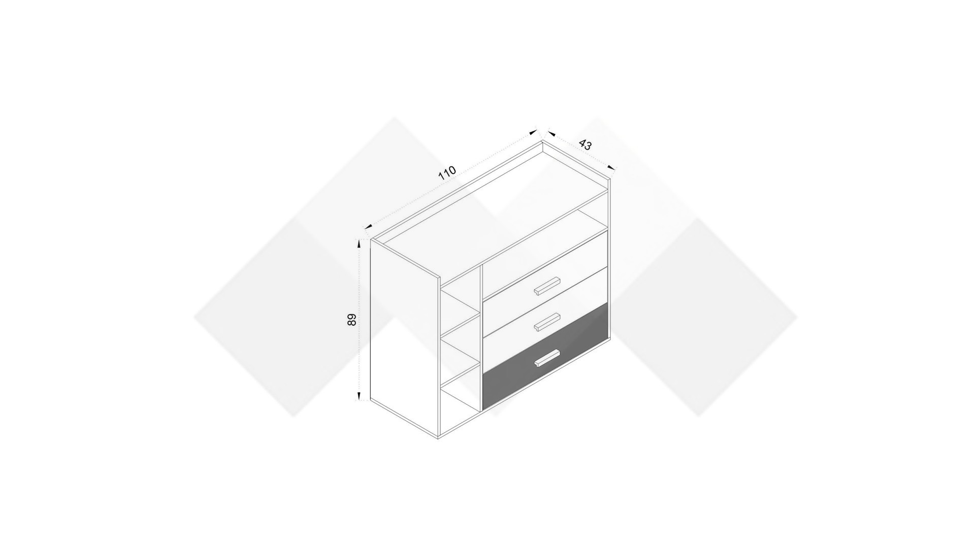 Скрин Димана ще те впечатли с функционалното си разпределение - три чекмеджета и четири отворени рафта, като горният плот е разположен по-ниско, което го превръща в допълнителен рафт. Отворените пространства са идеални за подреждане на книги и аксесоари, а в затворените можеш да съхраняваш дрехи, бельо, малки ел. уреди, козметика или други вещи, от които имаш нужда.
