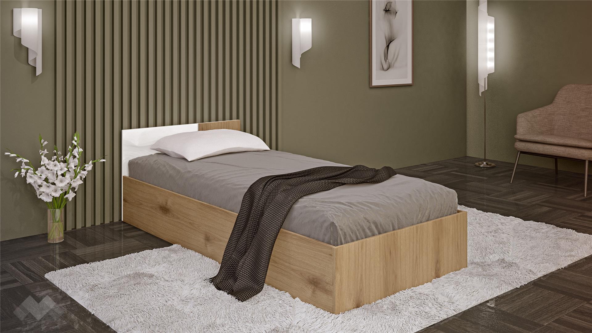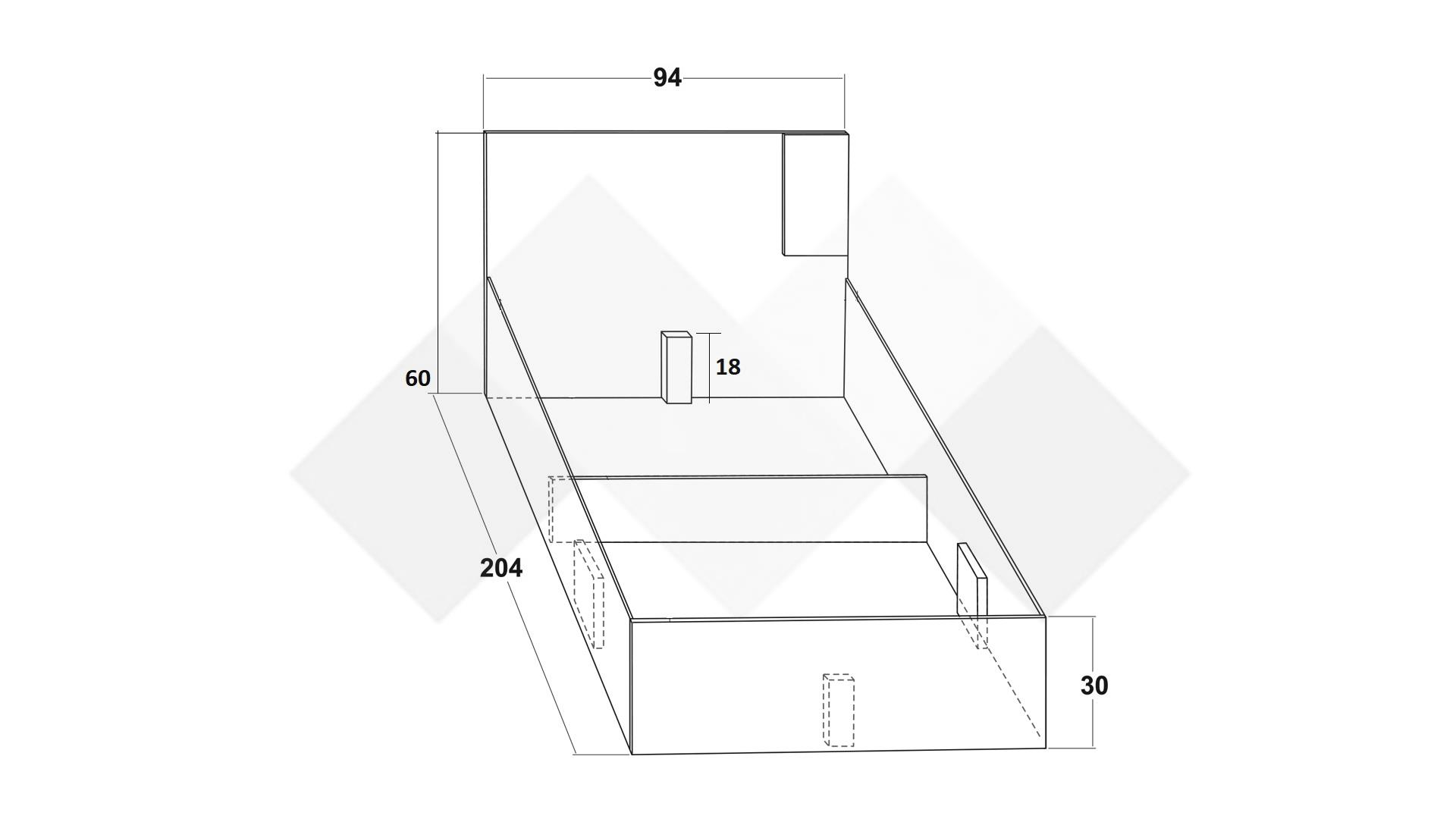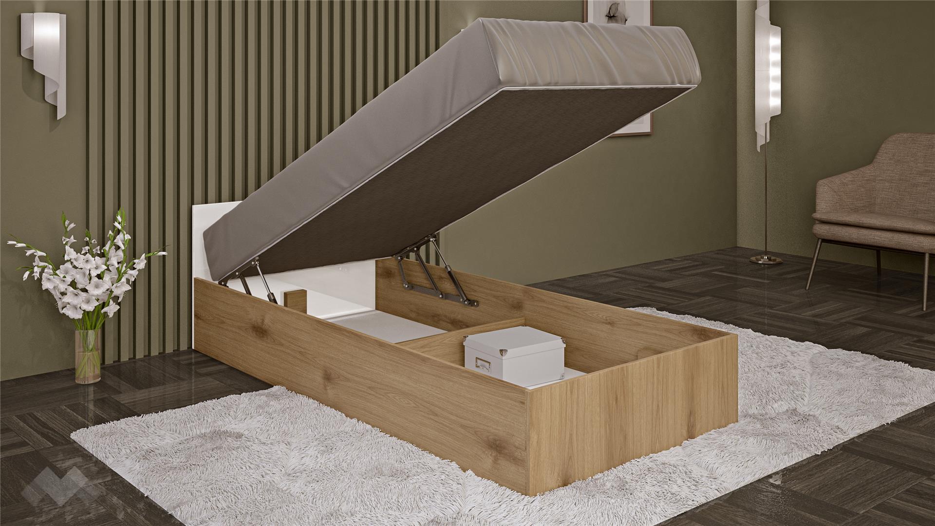 Леглото е с изчистени линии и стабилна основа, подходящо за матрак с размери 90/200 см. Включеният механизъм предлага удобно място за съхранение на завивки и възглавници, сезонни дрехи.