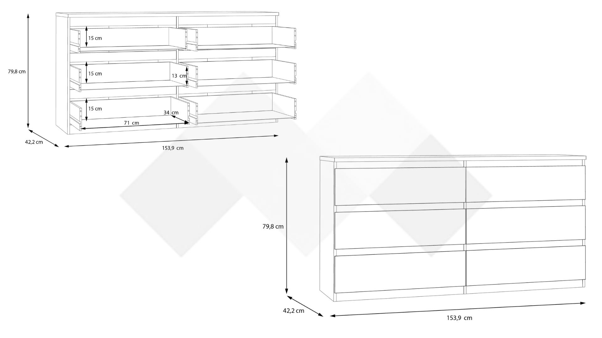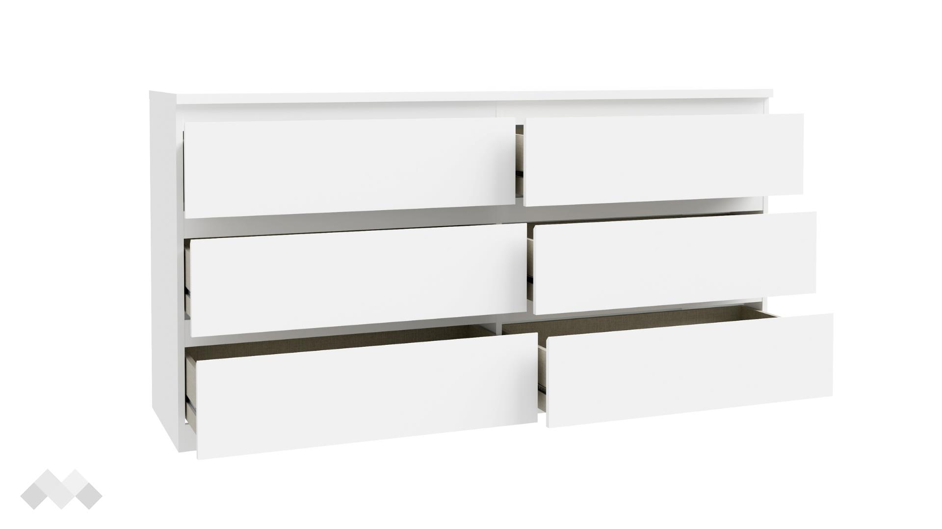 Моделът впечатлява с изчистената си визия и хармонични пропорции, които го правят подходящ както за класически, така и за съвременни интериори. Шестте чекмеджета позволяват удобно сортиране и подредба, без да се жертва стилът на обзавеждането.