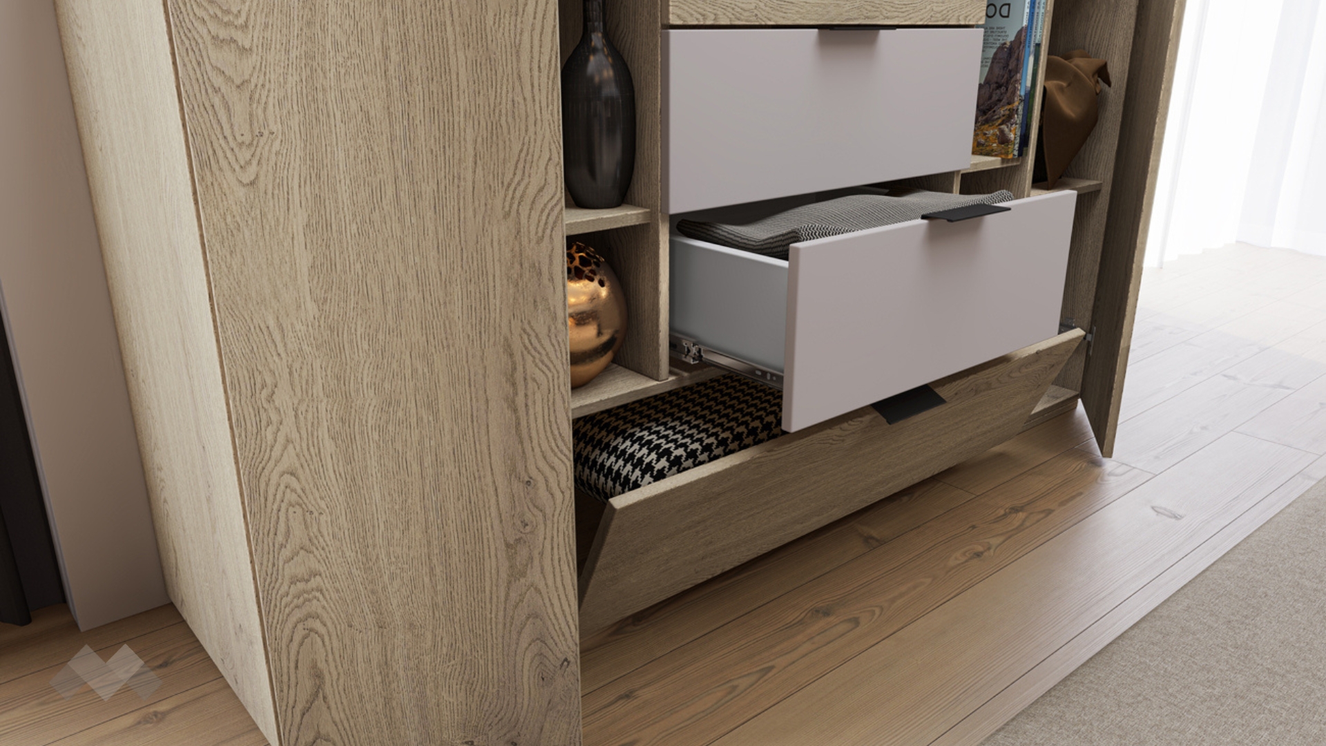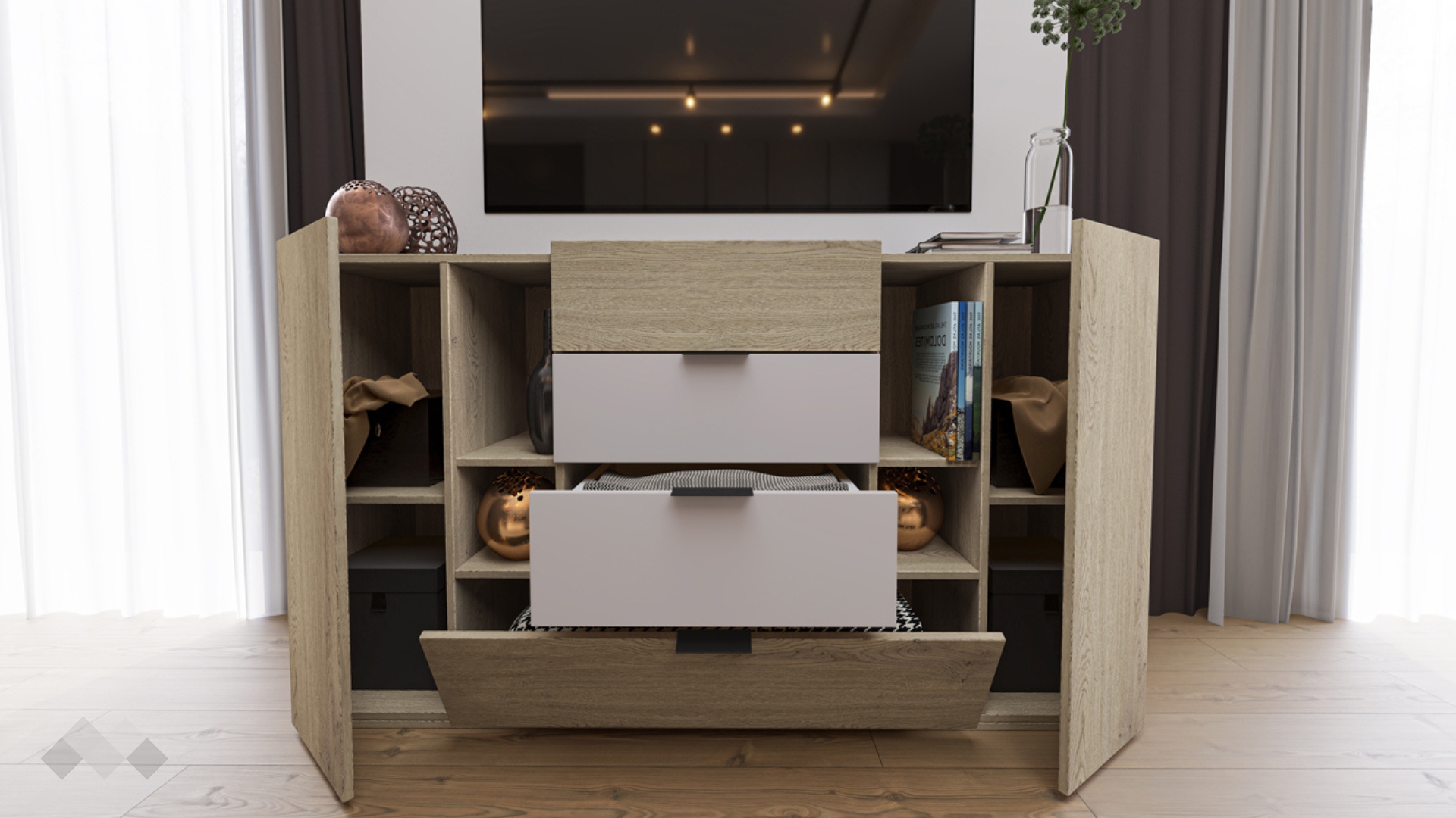 Скринът е снабден  с три чекмеджета за подредба на по-дребни вещи и три шкафа, които осигуряват допълнително пространство за принадлежности. Широкият шкаф разположен отдолу е с падаща врата и е удобен за съхраняване на по-обемни вещи. Зад всяка от двете врати със странично отваряне има удобен вътрешен рафт,който помага за оптимална организация на пространството.