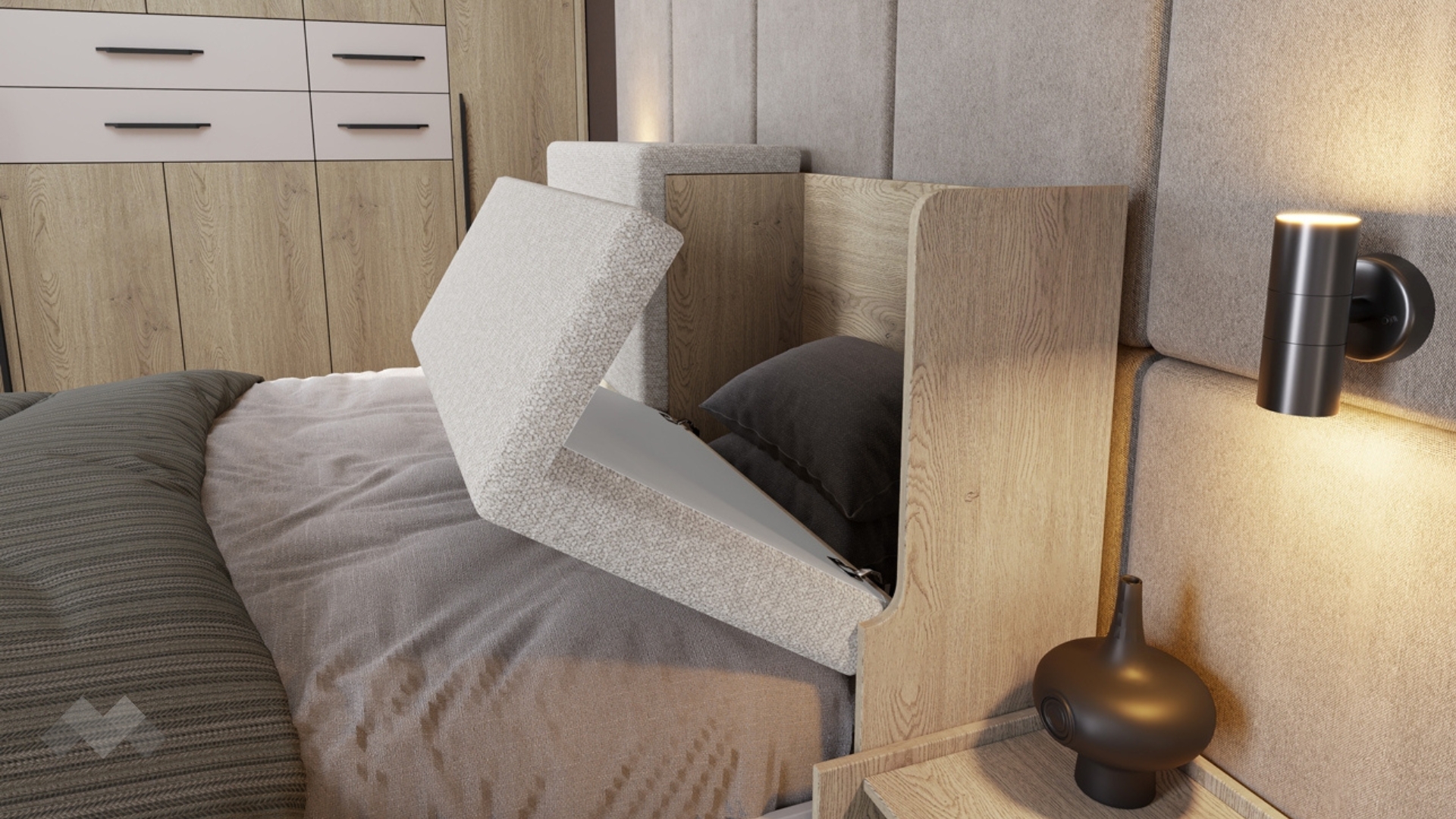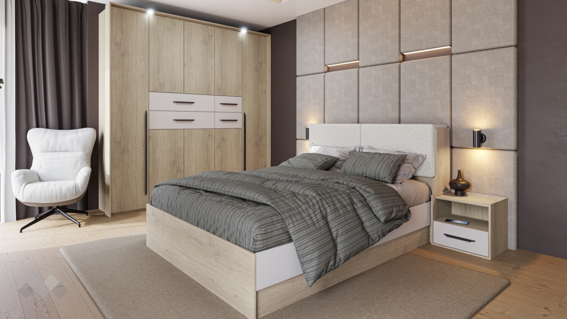 Спалнята е подходяща за матрак 160/200 см. Високата и удобна, тапицирана в светъл цвят табла ще ти осигури нужния комфорт при четене или почивка. Тя крие малка изненада – две практични вградени ракли,една за теб и една за половинката. Така всеки има своето място за завивки и възглавници, без битки за пространство.
