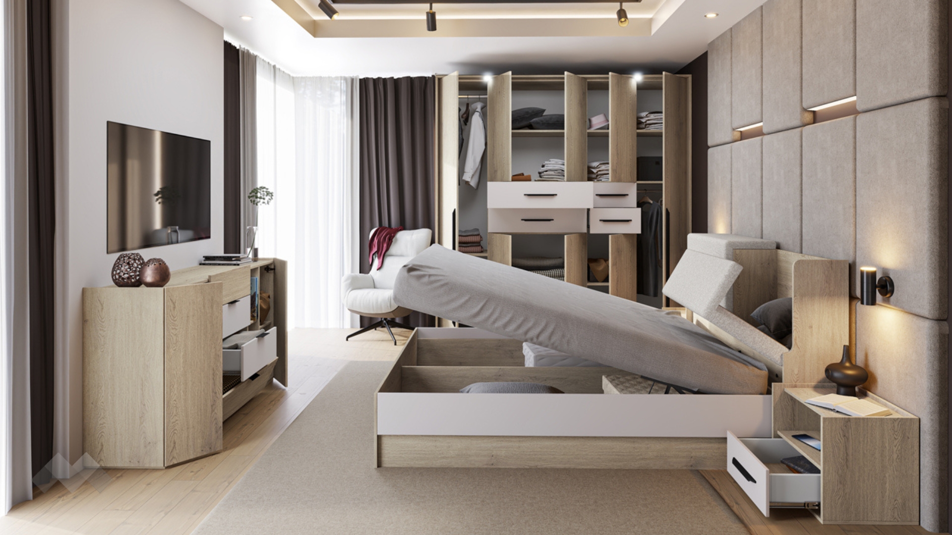 Спалнята е с включен механизъм за повдигане на матрака.