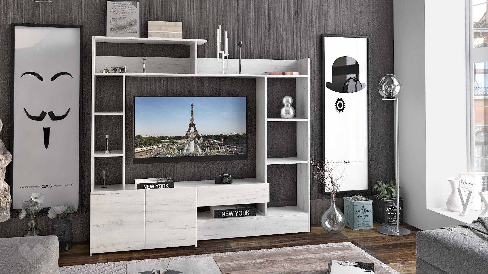 В основата на холна секция Флоренция има широк шкаф с две врати, две практични чекмеджета и ниска открита полица, идеална за ТВ приемници и друга техника. Пространството над телевизора също е предвидено за подреждане на вещи, а добавеният гръб на рафта умело завършва дизайна на секцията.